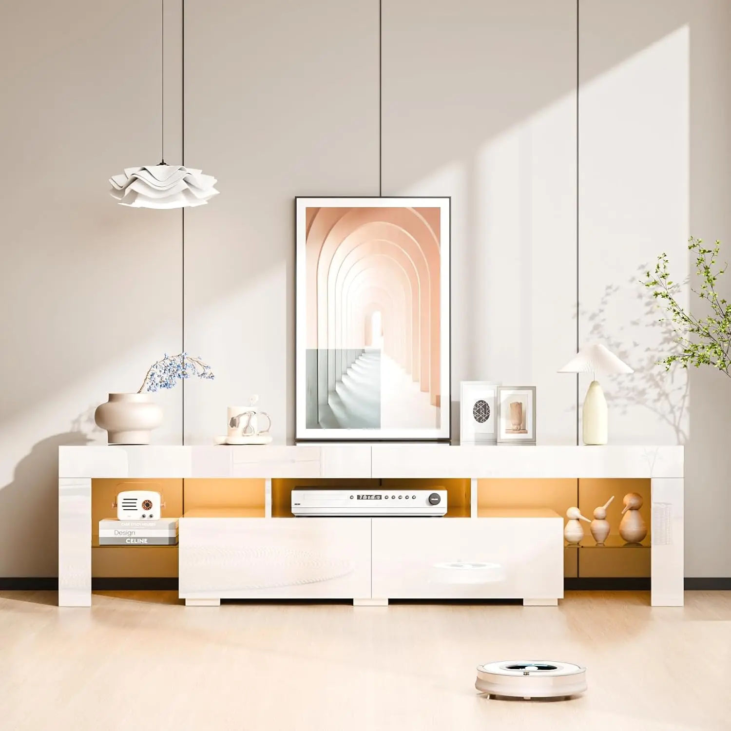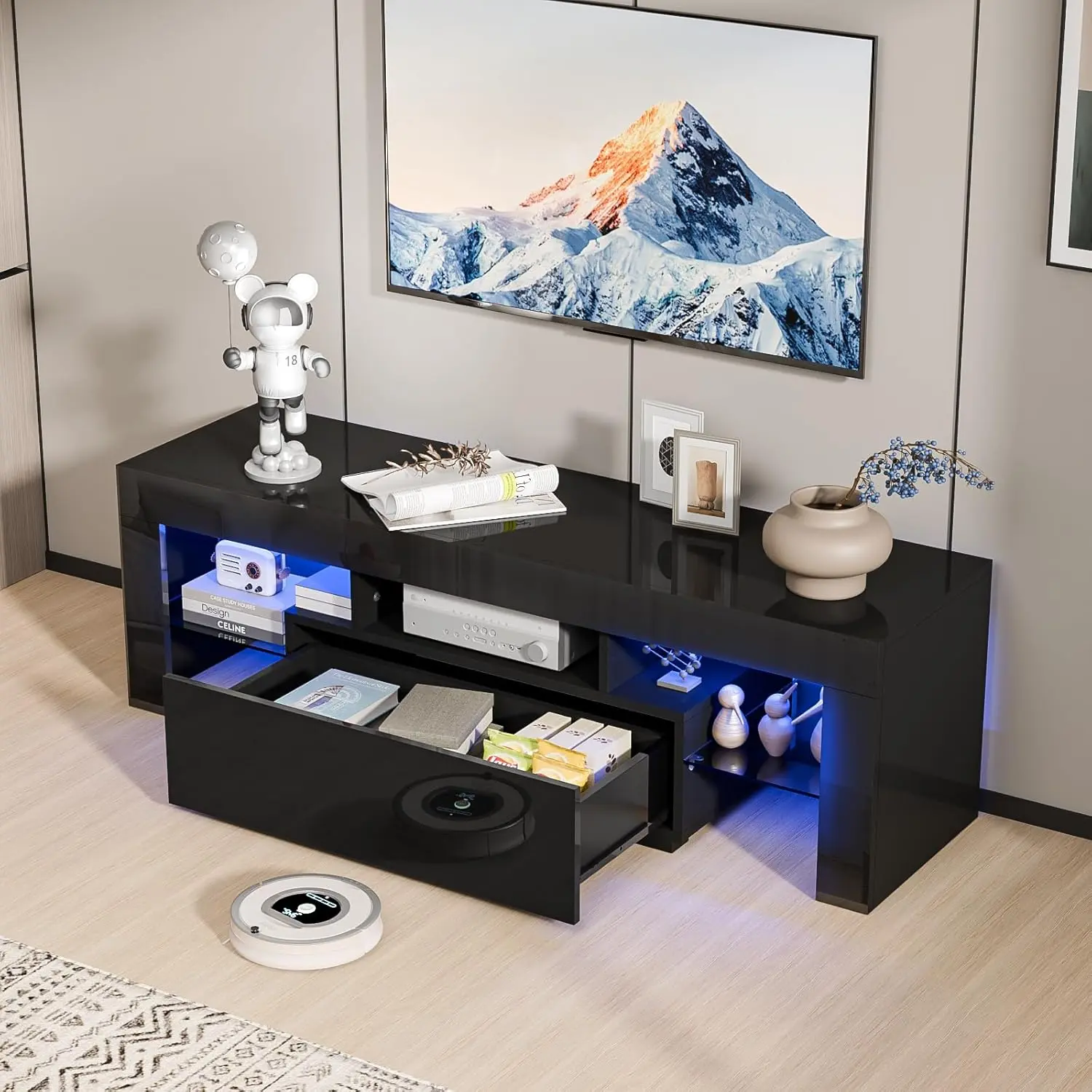 ·【Large Storage Space】: The LED TV stand designed with drawers and open shelves, keep all your CDs, DVDs, books and magazines and electronic essentials in the cabinet that can help you keep your home tidy and clean.
