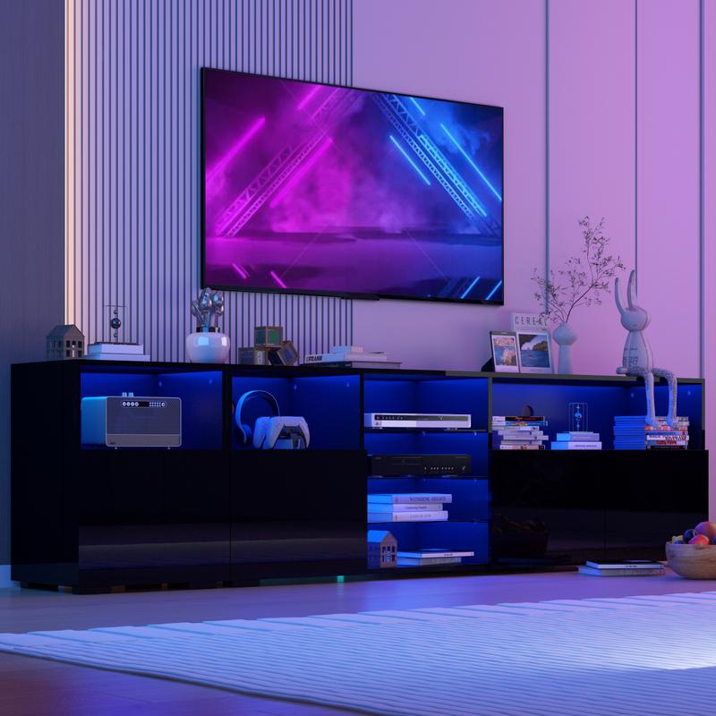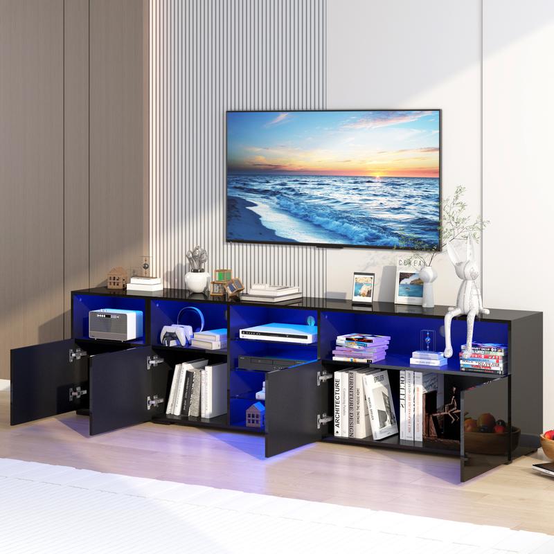 High Glossy Large TV Stand :The High glossy TV stand has front full high gloss visible on the front surface.Made of UV high glossy coated P2 grade particleboard, and the smooth paint process, this TV stand is scratch proof and waterproof,with up to 300 pounds bearing capacity.