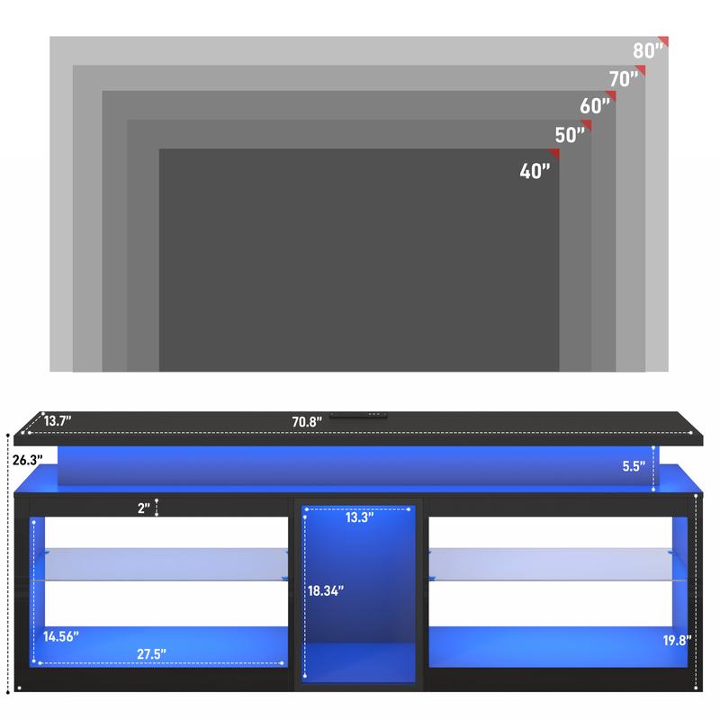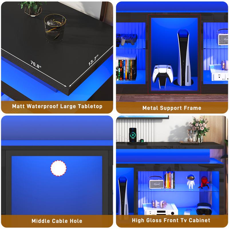 2. Entertainment Center with Glass Shelves: This television stand features 4 open shelving areas to hold your items such as gaming devices, hero figures or photo frames. Middle TEMPERED GLASS could be adjusted at 3 different height. Easily add modern vibes into your home.