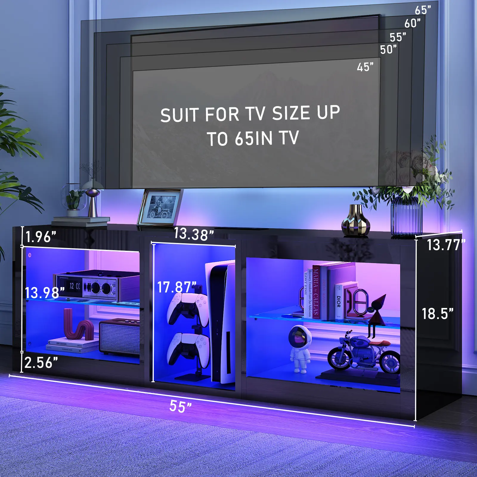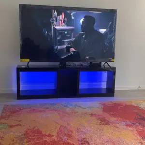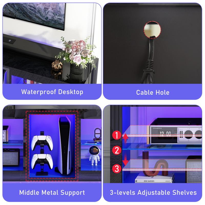 Cool Smart LED Lights : The LED TV cabinet have 4 modes: RGB color, microphone,timing and music mode. More than 70000 colors and 30 flashing modes are controlled by wireless remote control and mobile phone APP. The timing function controls the LED TV cabinet time and automatically turns off the lights. The LED light color changes with the rhythm of sound and music, highly enhancing your binge watching or TV game atmosphere.