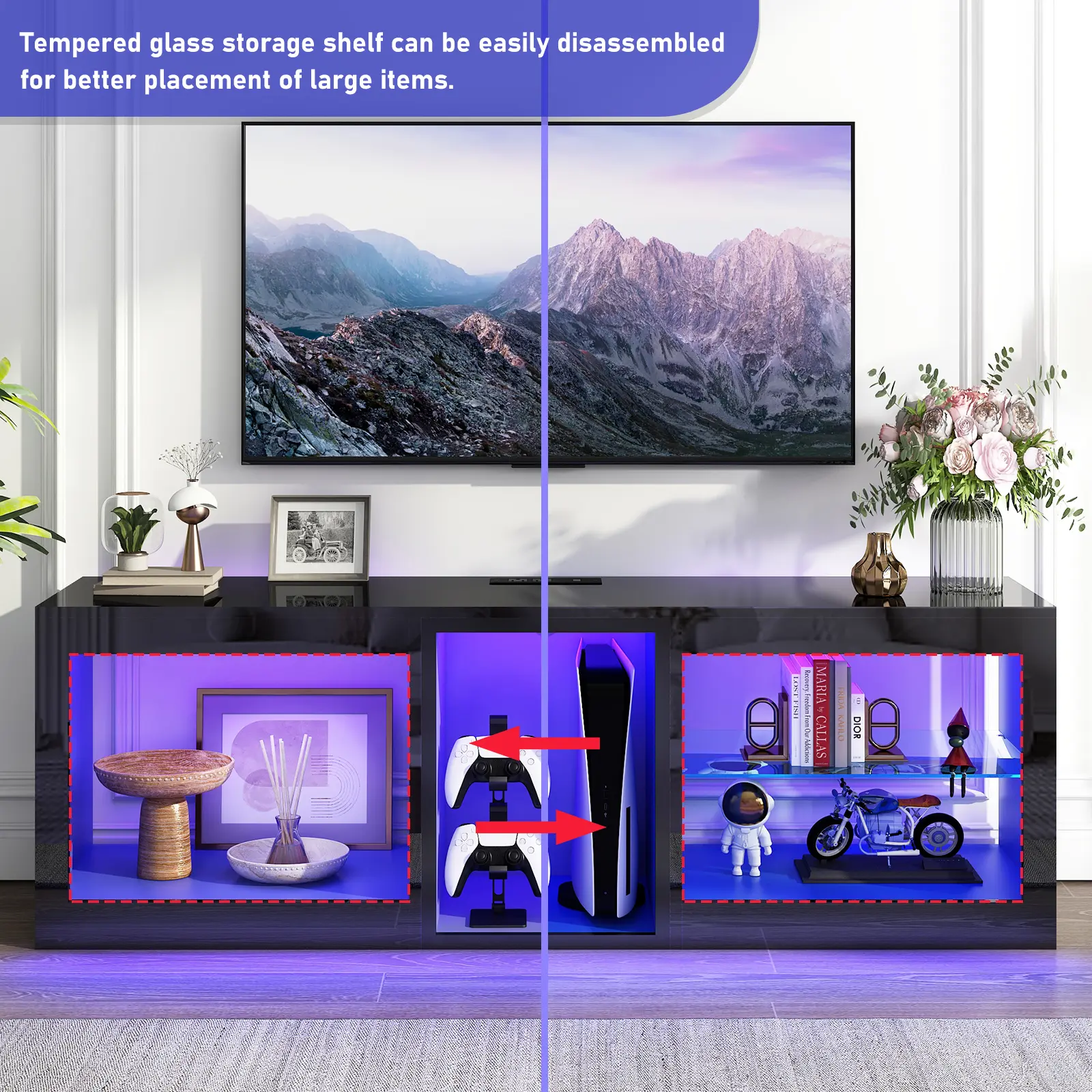 Enough Storage Space : The TV stand has 3 layers of height adjustable glass shelves on both sides for storing DVDs, stereos,etc.The shelves can be removed or adjusted according to the different heights of the items, providing you with flexible open storage space to accommodate different item sizes.