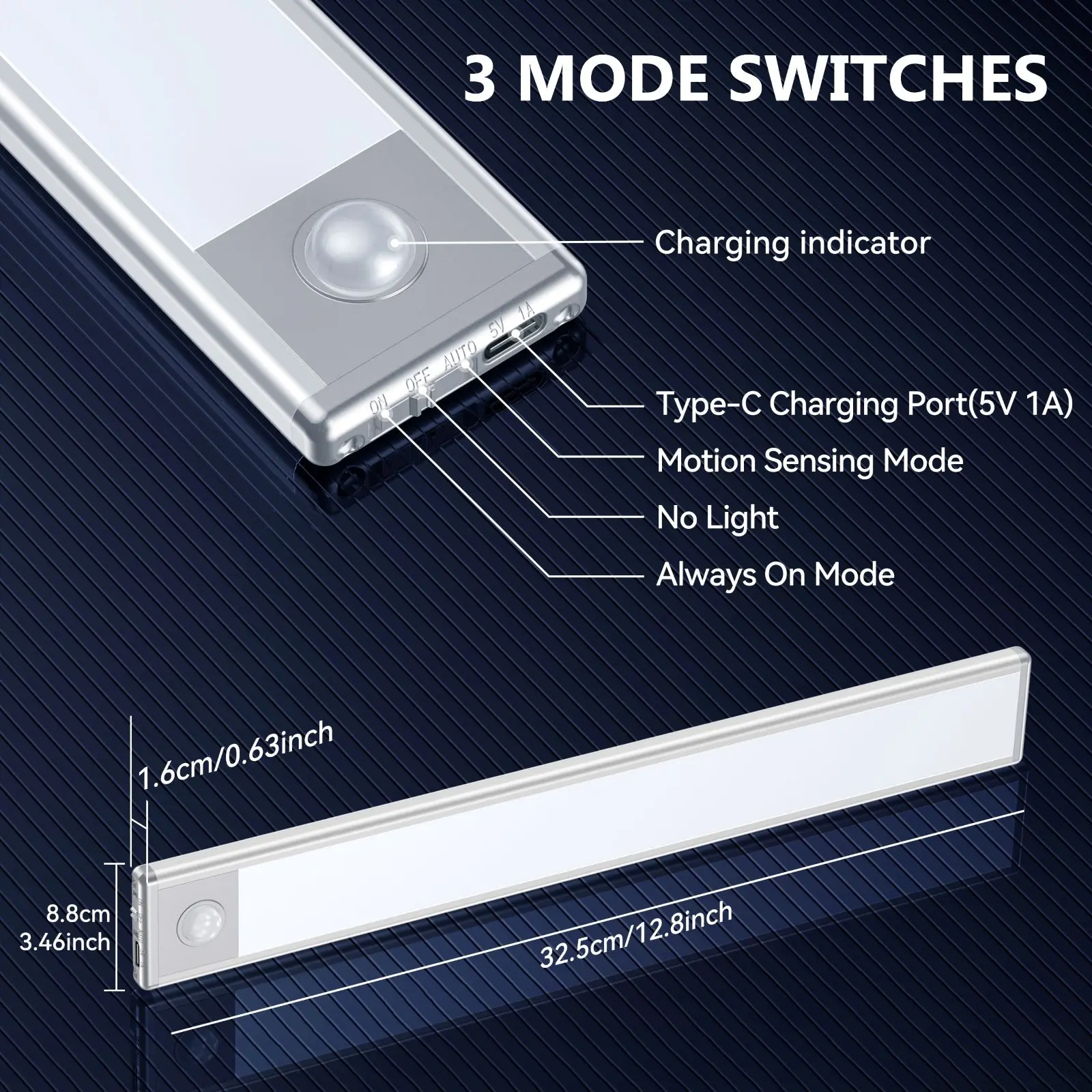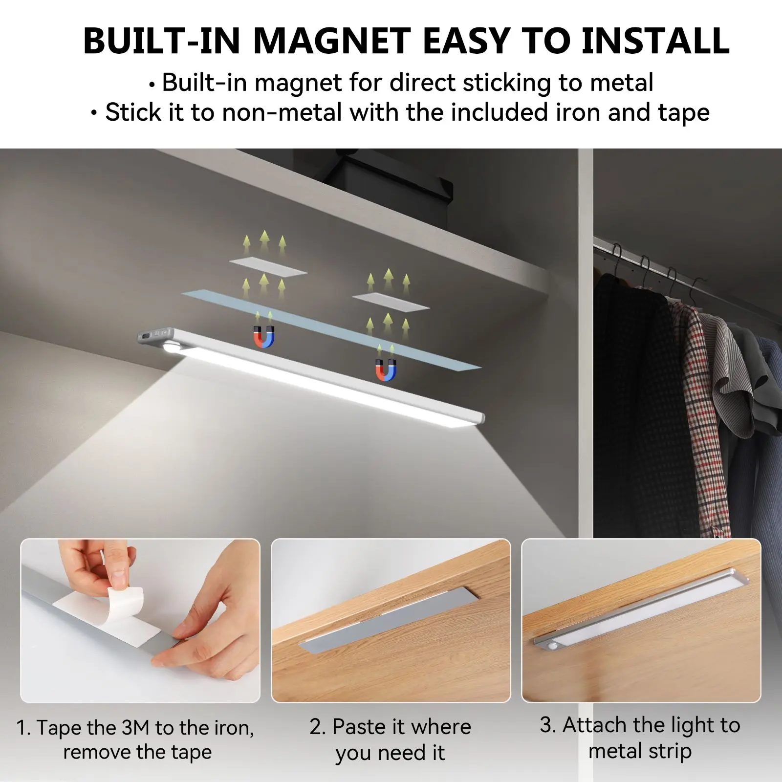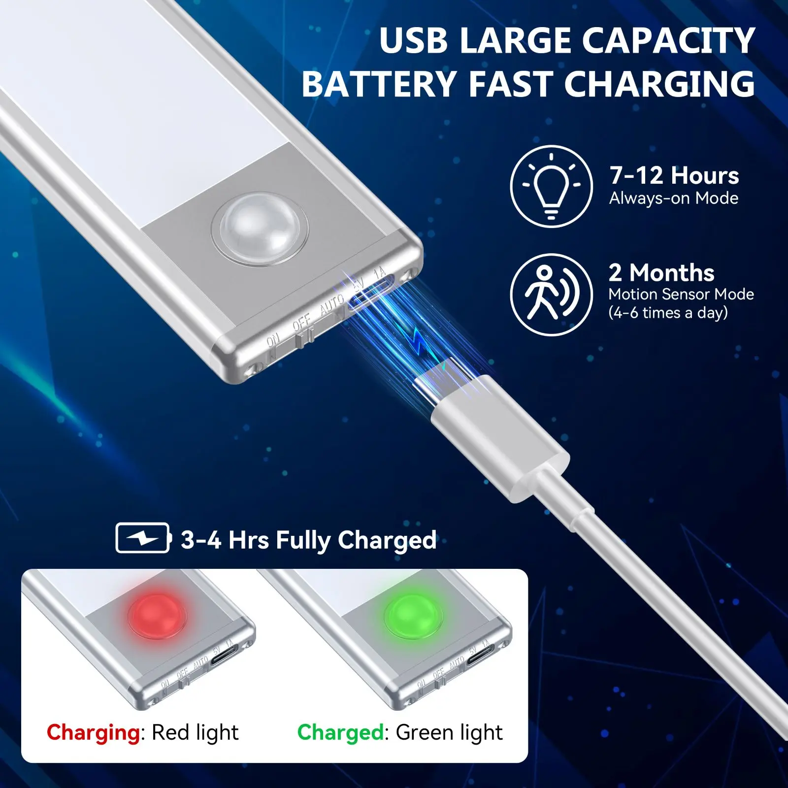 Luz LED para debajo del gabinete, sensor de movimiento brillante para interiores, luz magnética adhesiva, luces debajo de la encimera, carga USB inalámbrica