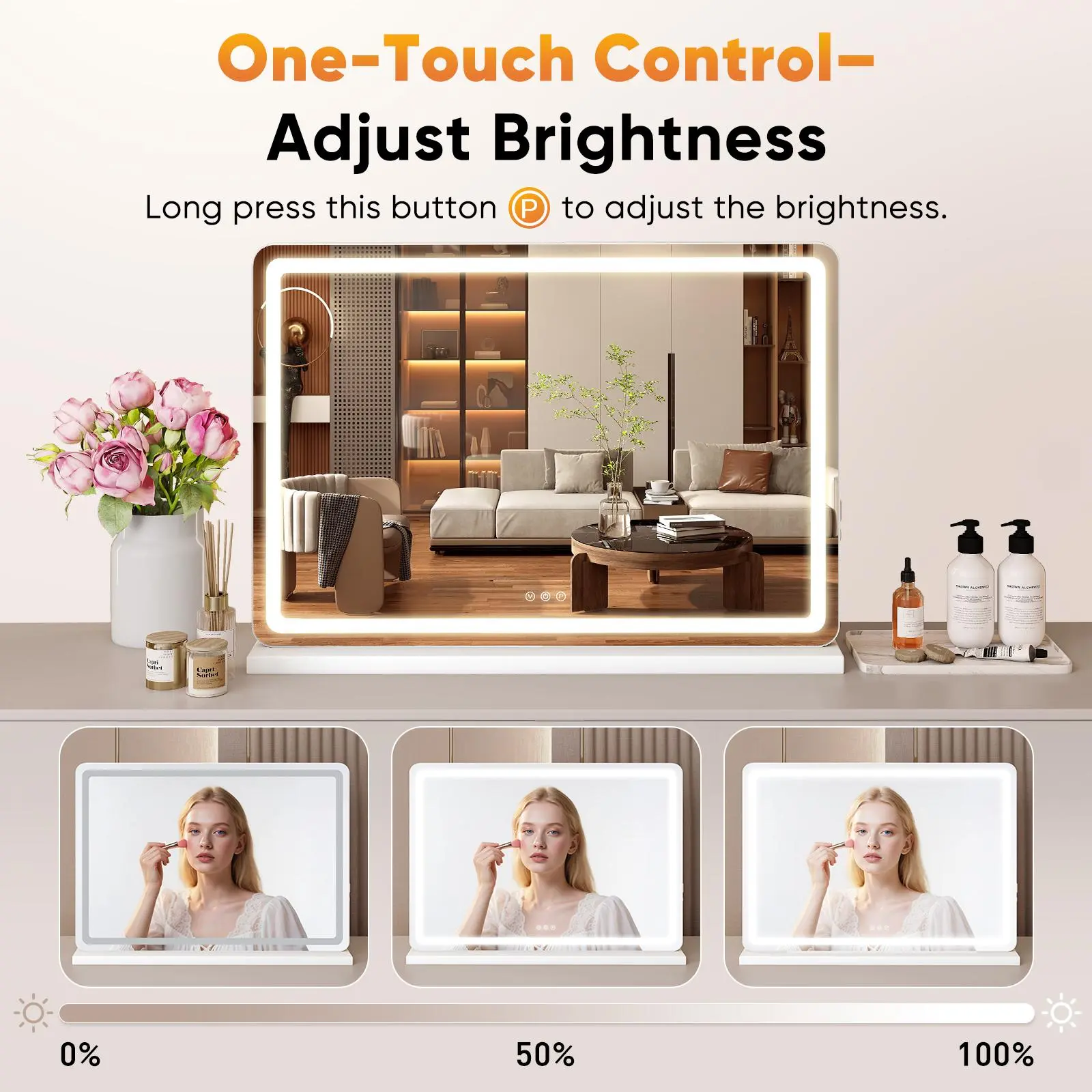 ·Professional Adjustable Lighting: lighted vanity mirror choose from three distinct light modes and seamlessly adjust brightness across a wide 0-6000K color temperature range, perfectly simulating natural daylight, warm evening light, or cool white settings for flawless makeup application in any environment.