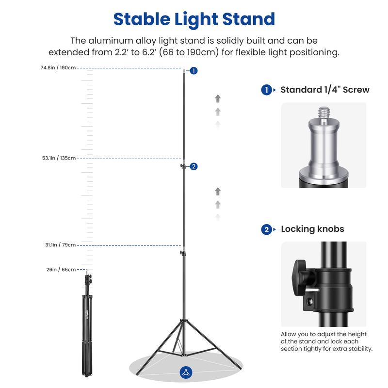 ·Stable Light Stand- Aluminum alloy light stand is solidly built and can extend from 26" to 75" (66 to 190cm) for flexible light positioning. The locking knobs enable you to adjust the stand’s height and tightly lock each section for extra stability