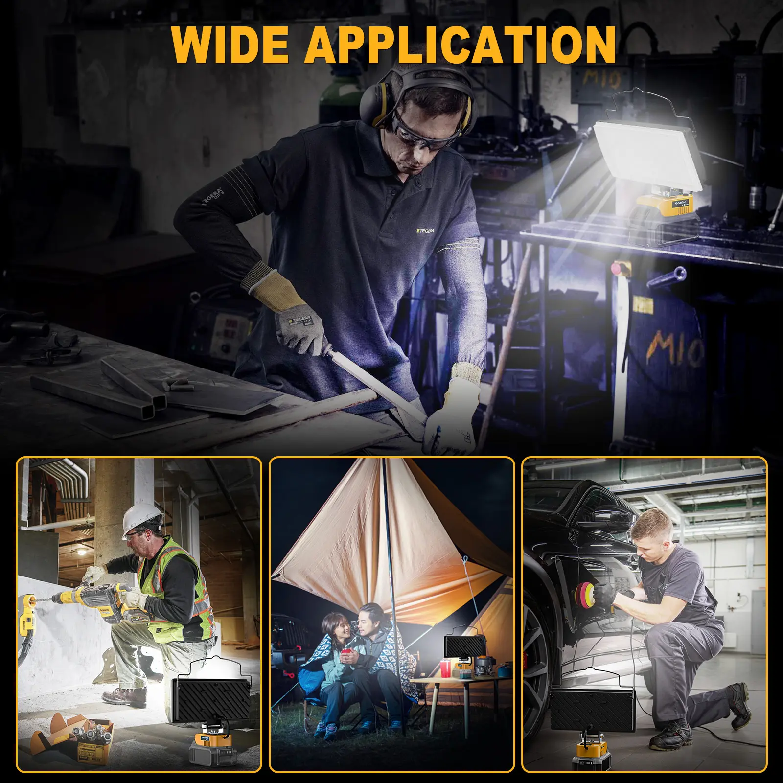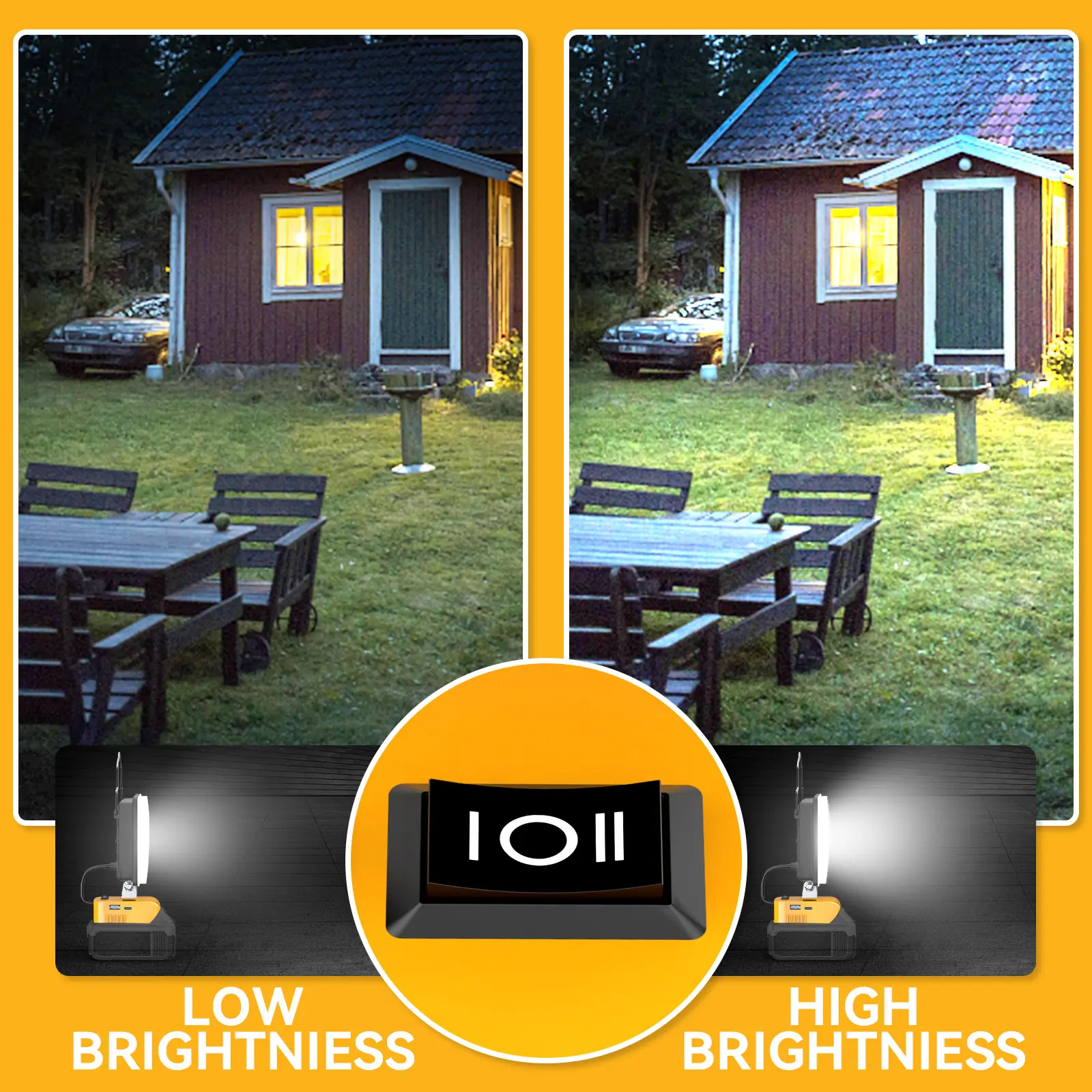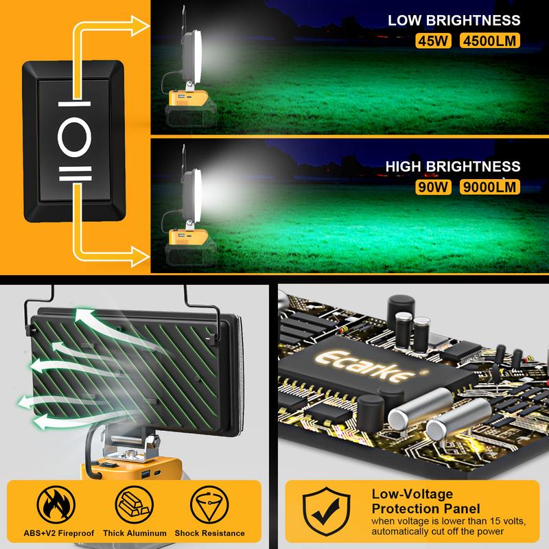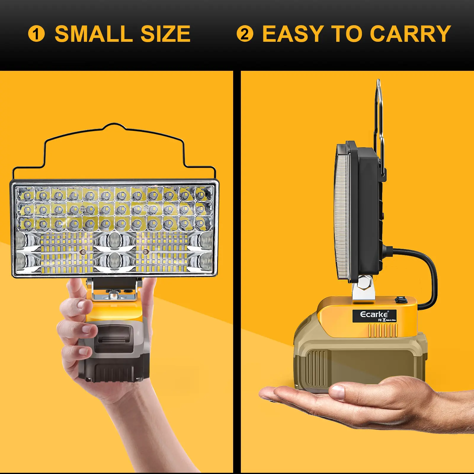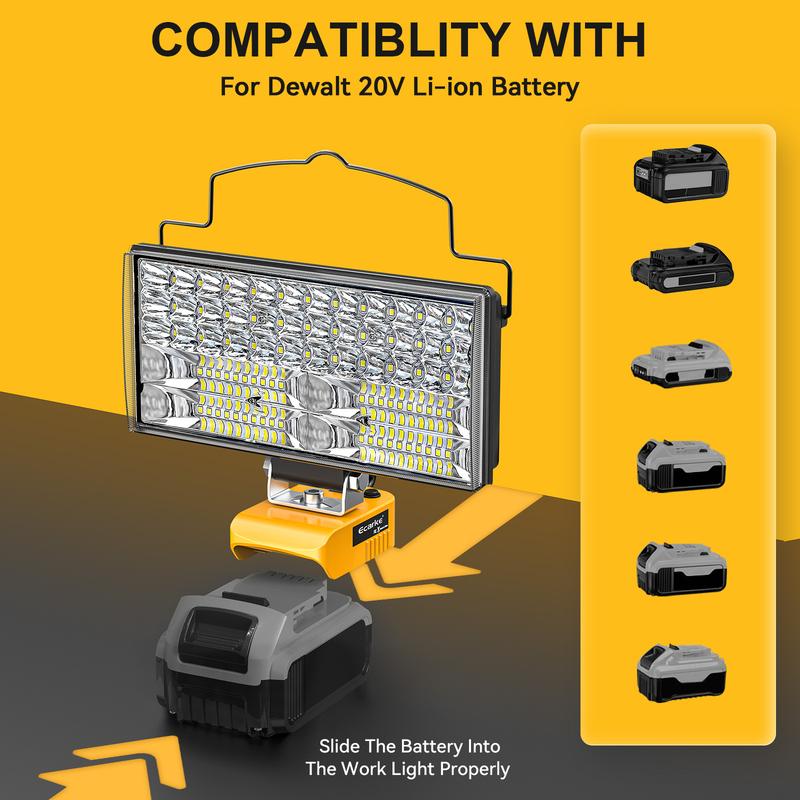 Wide applicability & 2-Year Guarantee——This portable LED work light is compatible with DeWalt tool 20V batteries. It can be used in a variety of scenarios such as car repair, power maintenance, plumbing and electricity installation, camping, emergency lighting, etc. Ecarke LED construction lights are reliable and come with a 2-year warranty to ensure your peace of mind. Our 24/7 customer service is always available to help you with any questions you may have.