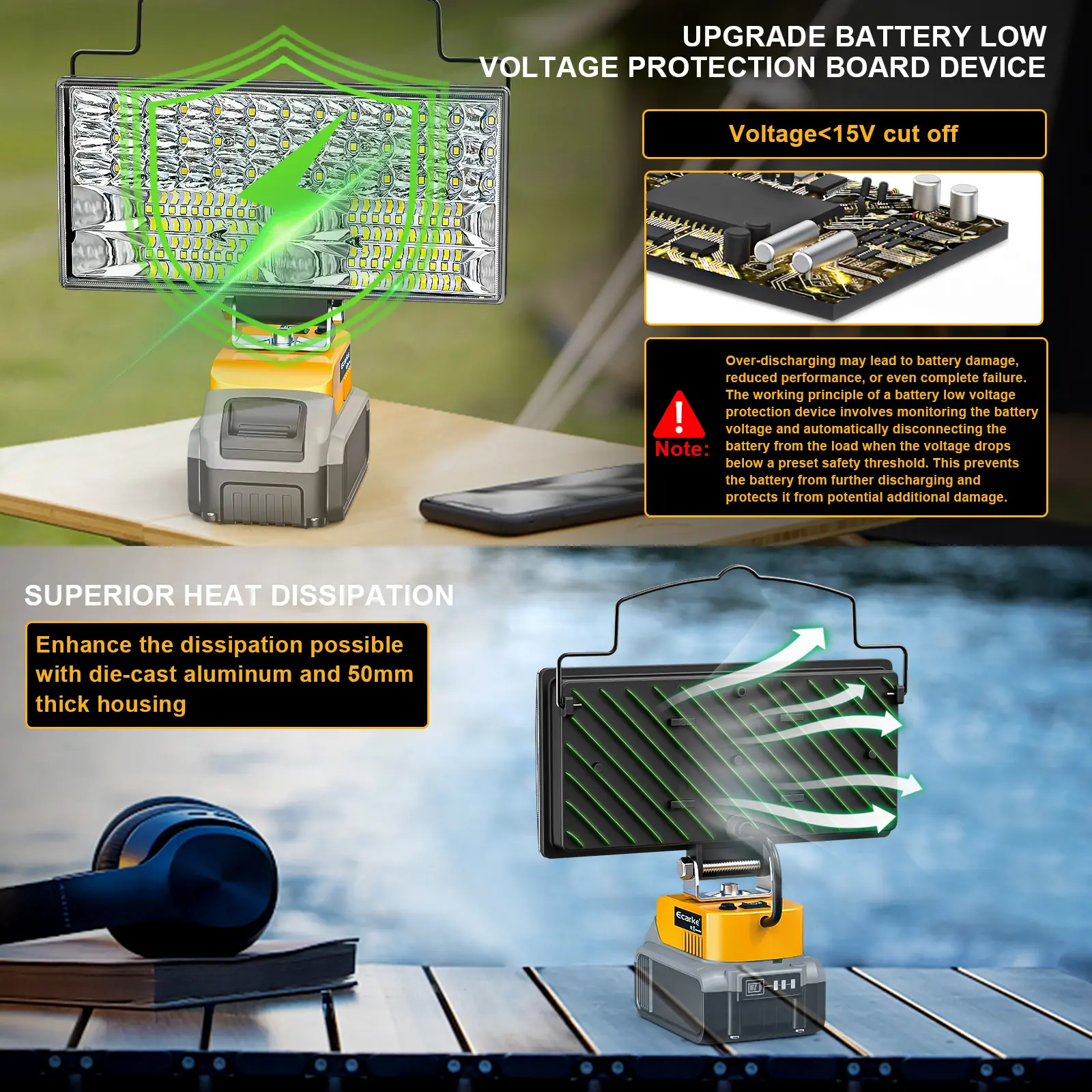 BATTERY POWERED, SAFE TO USE——This battery light is designed to be compatible with Dewalt 20v lithium-ion batteries DCB206 DCB205 DCB204 DCB181 DCB182 DCB200 DCB203 DCB205-2 DCB204-2 DCB206-2 and more (Battery NOT included) , featuring a built-in low-voltage protection board. When the voltage drops below 15v, the LED work light will automatically cut off. Friendly Reminder: When the 20v max led work light is not in use, please remove it from the battery to prevent battery depletion.