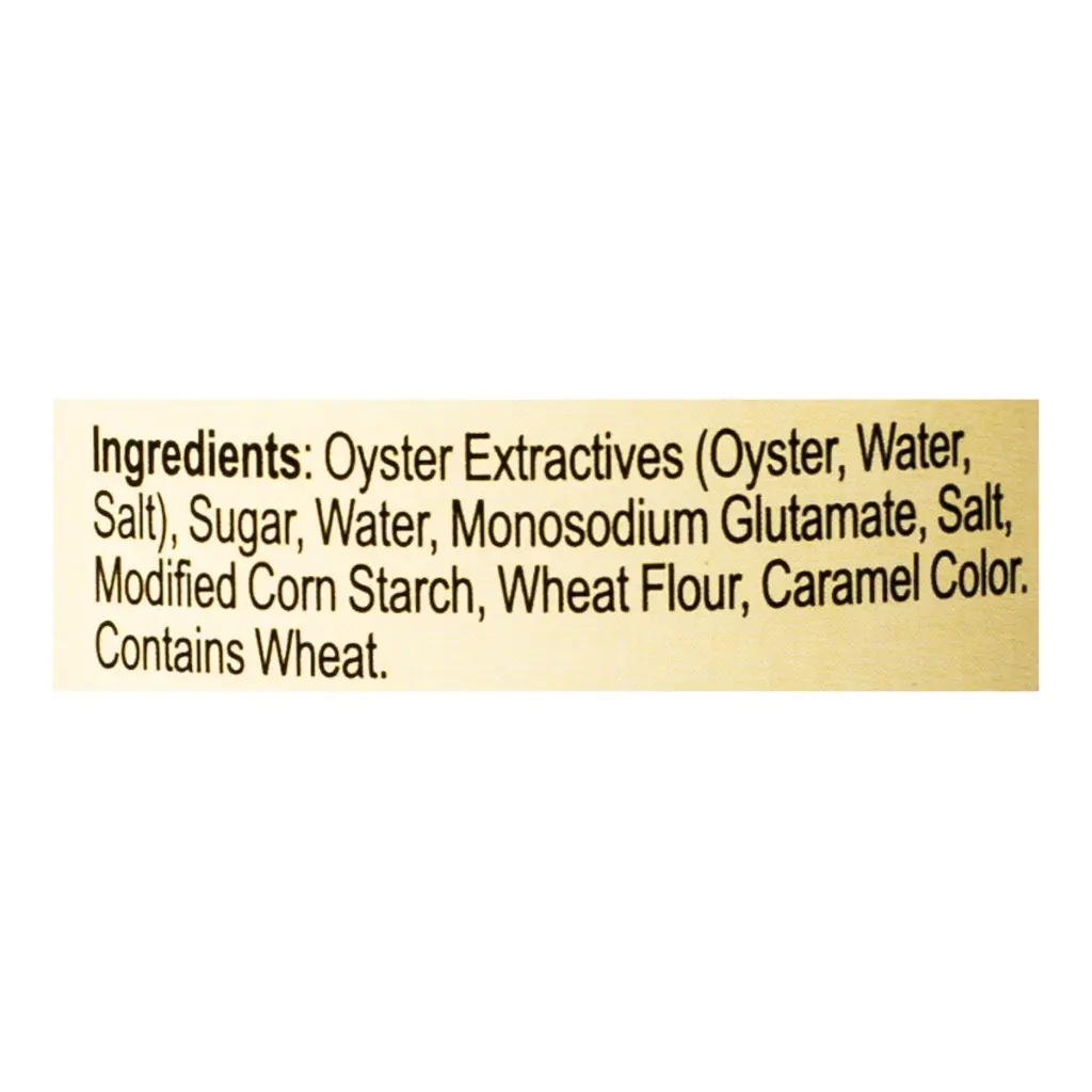 Ingredients: Oyster extractives (oyster, water, salt), sugar, water, monosodium glutamate, salt, modified corn starch, wheat flour, and caramel color.