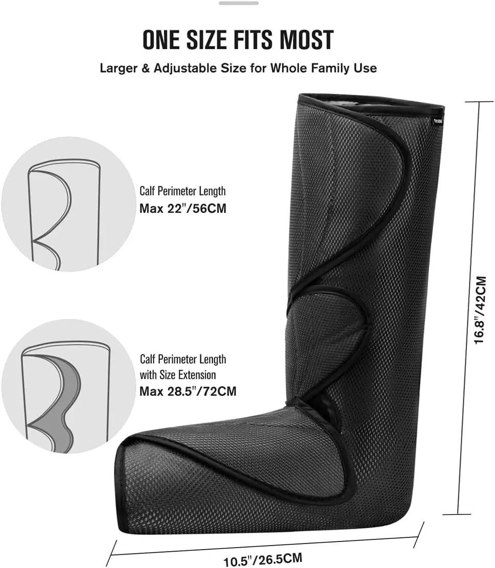 ·LARGER & ADJUSTABLE SIZE WITH SIZE EXTENSIONS - the leg and foot wraps can be adjusted easily to change the size and intensity, max calves size can be 28.5 inches with 2 size extensions included for different people to use. A portable storage bag inside, portable and easy to carry.