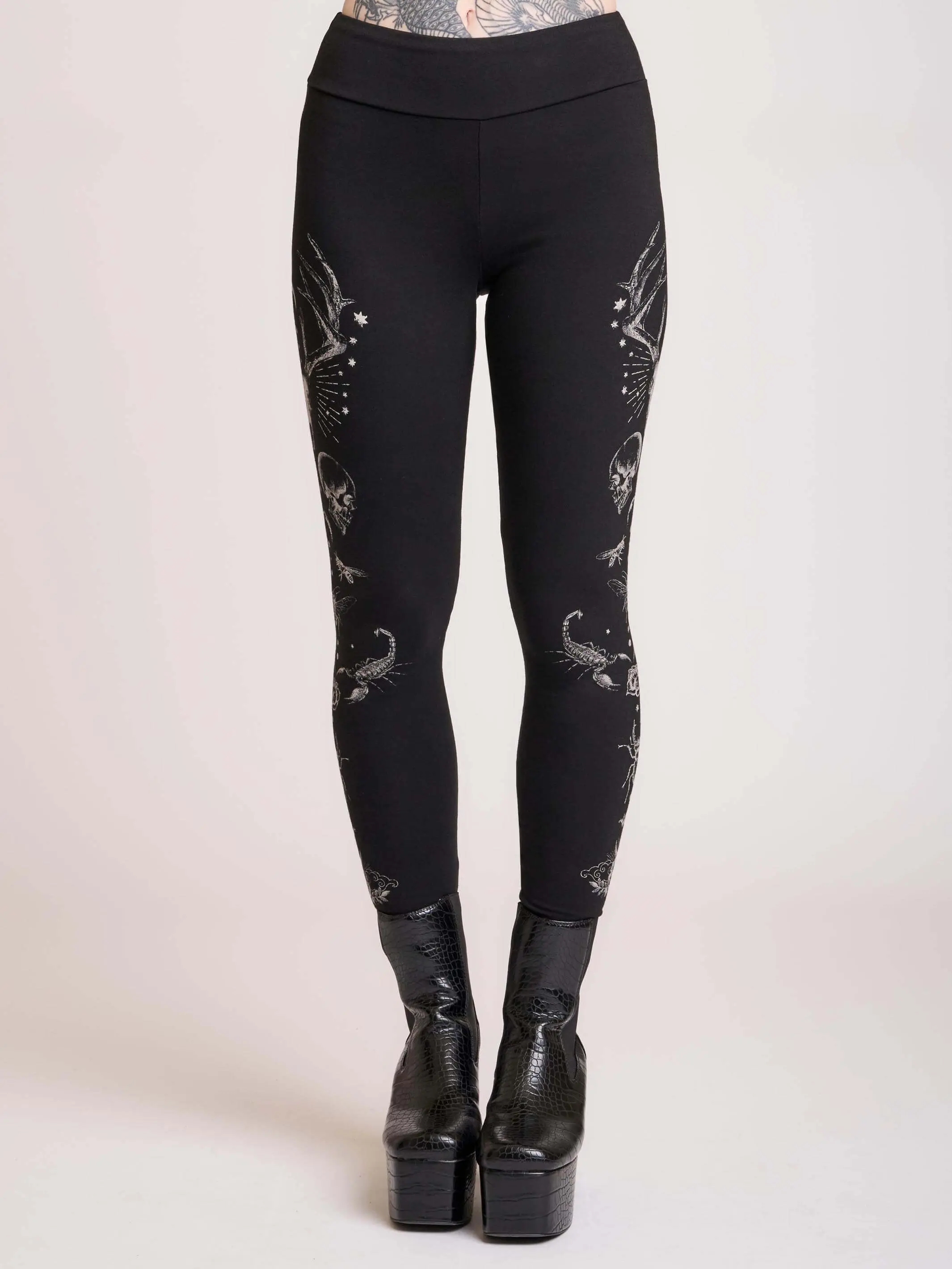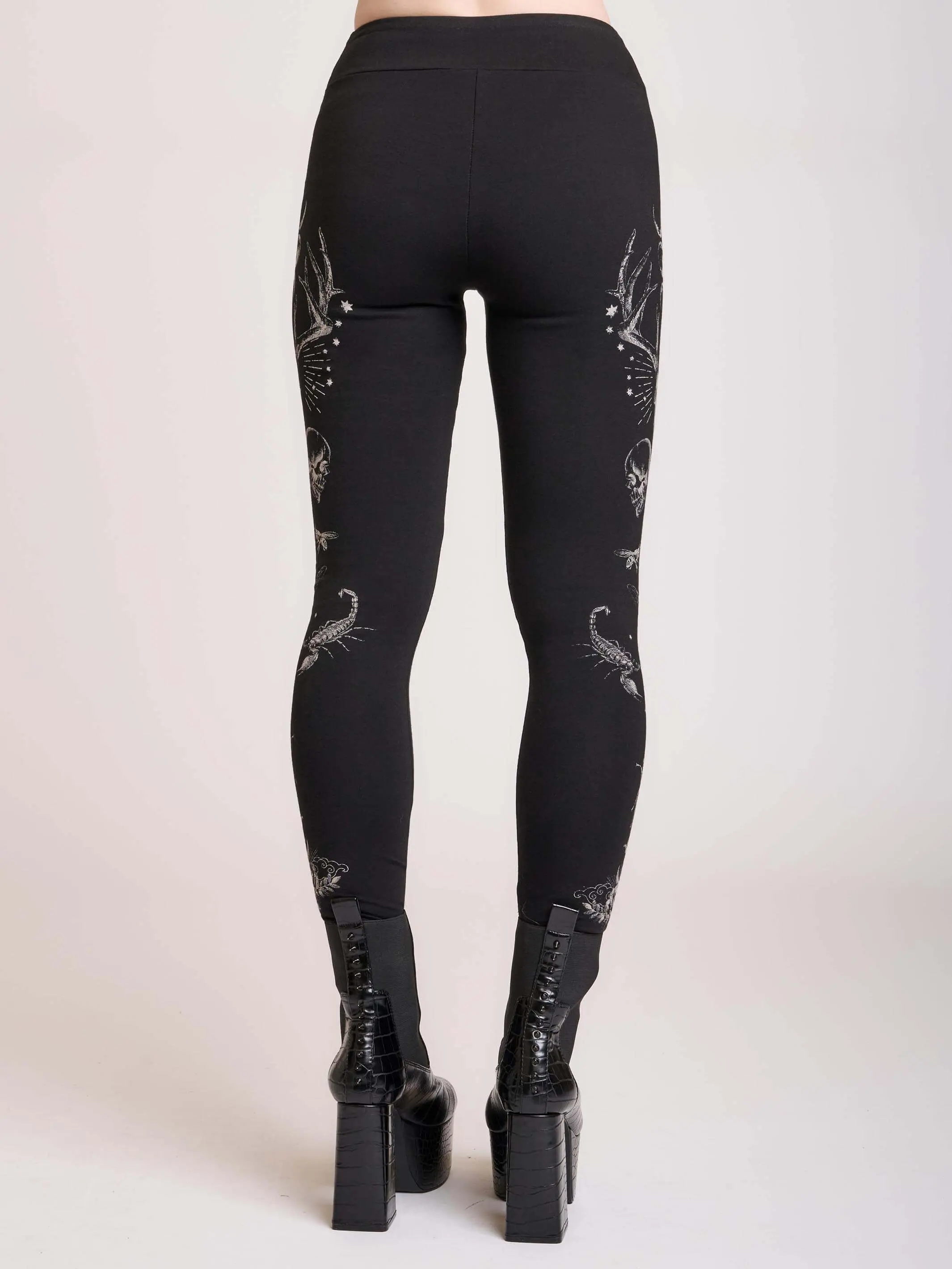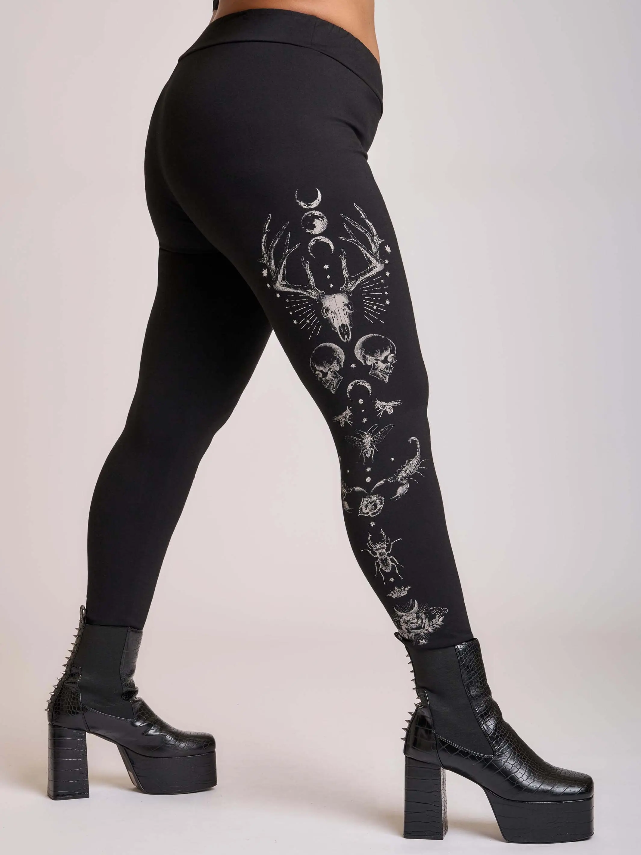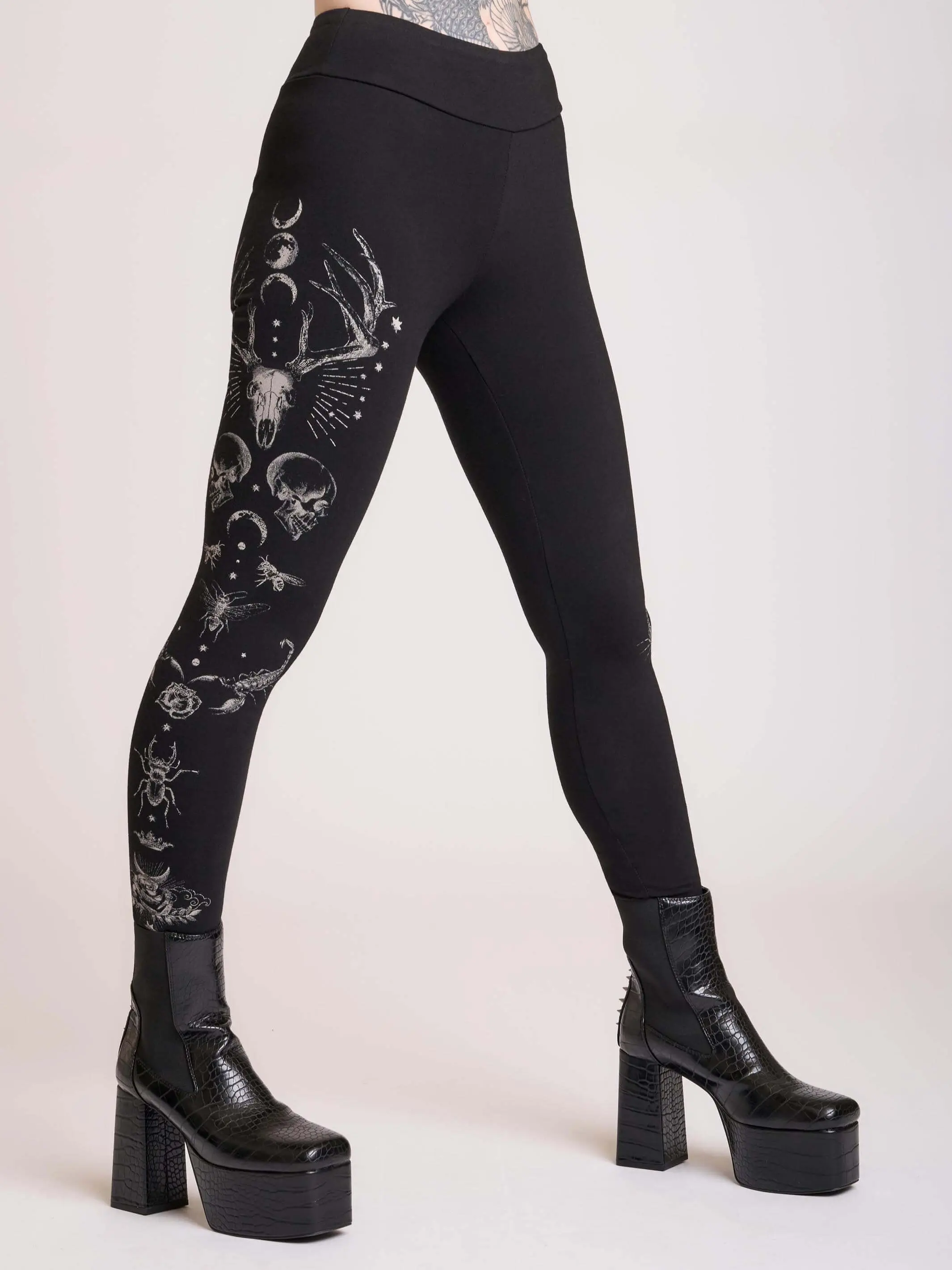 Featuring striking monochrome artwork—stag skulls, moon phases, stars, insects, skull motifs, and mystical detailing—these witchy leggings pair perfectly with platform boots, oversized tees, or layered streetwear for a bold night-out look or elevated lounge fit.