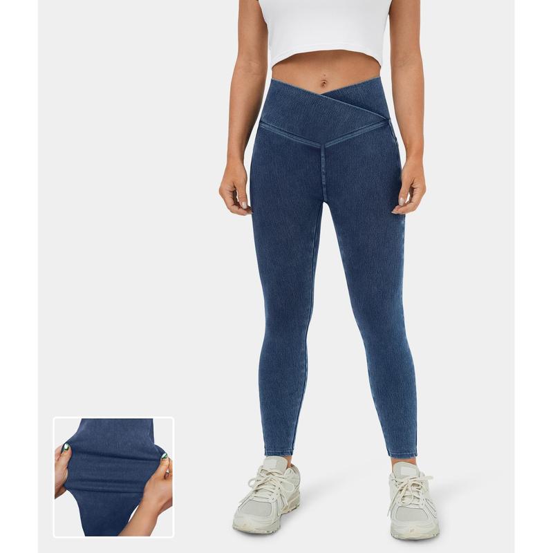 Halara Flex Crossover Side Pocket Washed Stretchy Knit Denim Work Leggings#TikTokShopBacktoSchool
