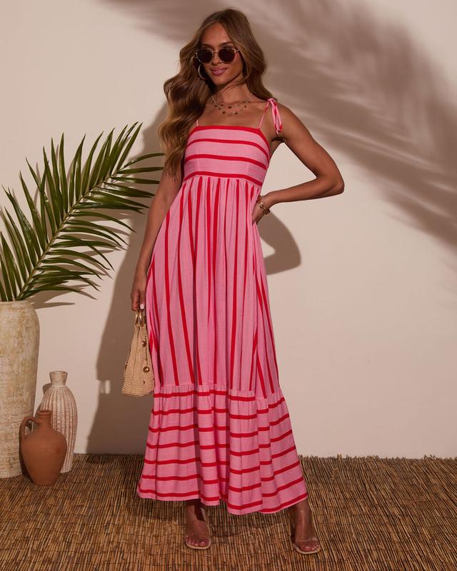 Meet your suitcase's new star: the Leima Striped Maxi Dress. With its lightweight linen fabric and effortless flow, this dress brings all the easy-breezy energy your vacay wardrobe needs. The smocked back panel gives you that comfy, flexible fit, while adjustable shoulder ties add a touch of charm (and customization).