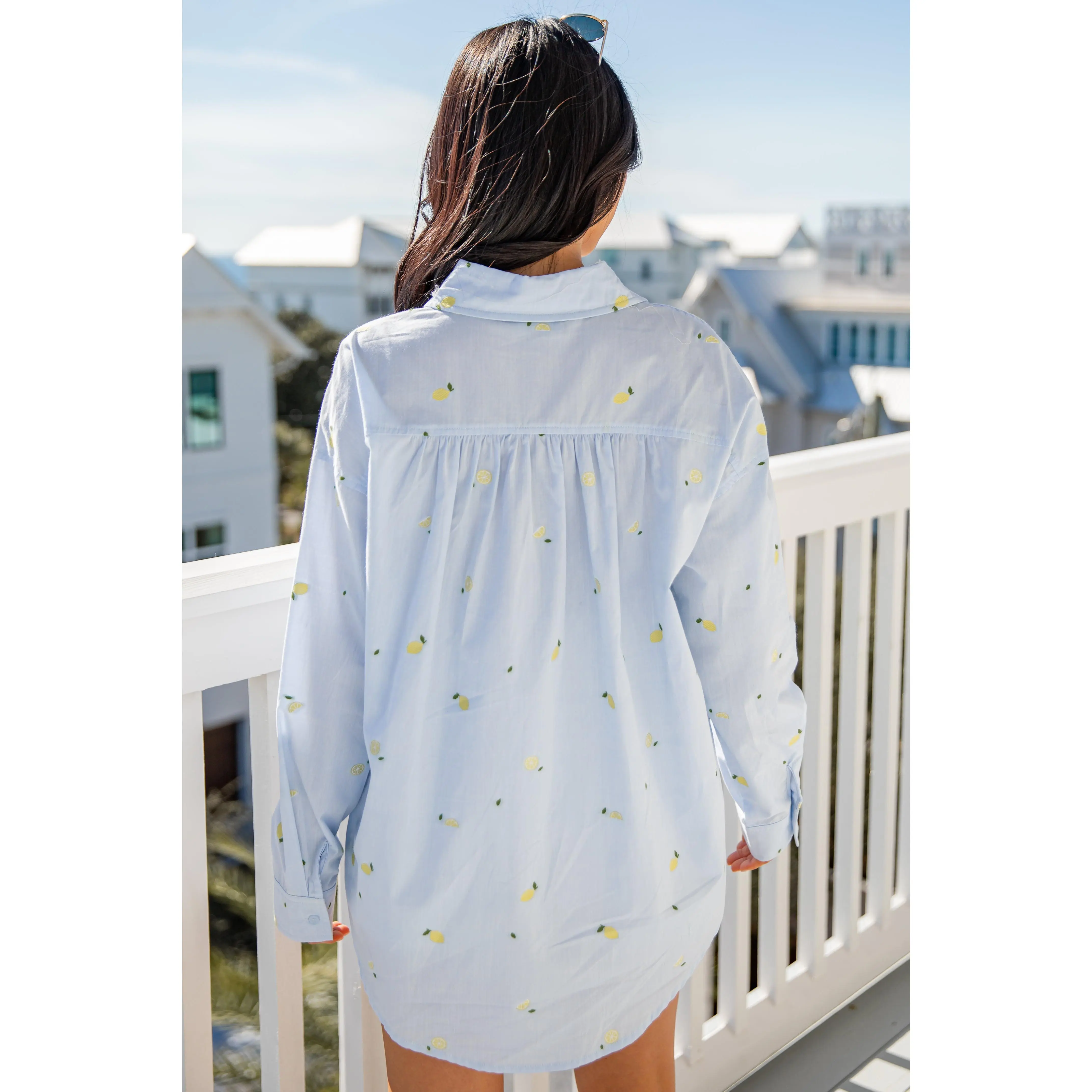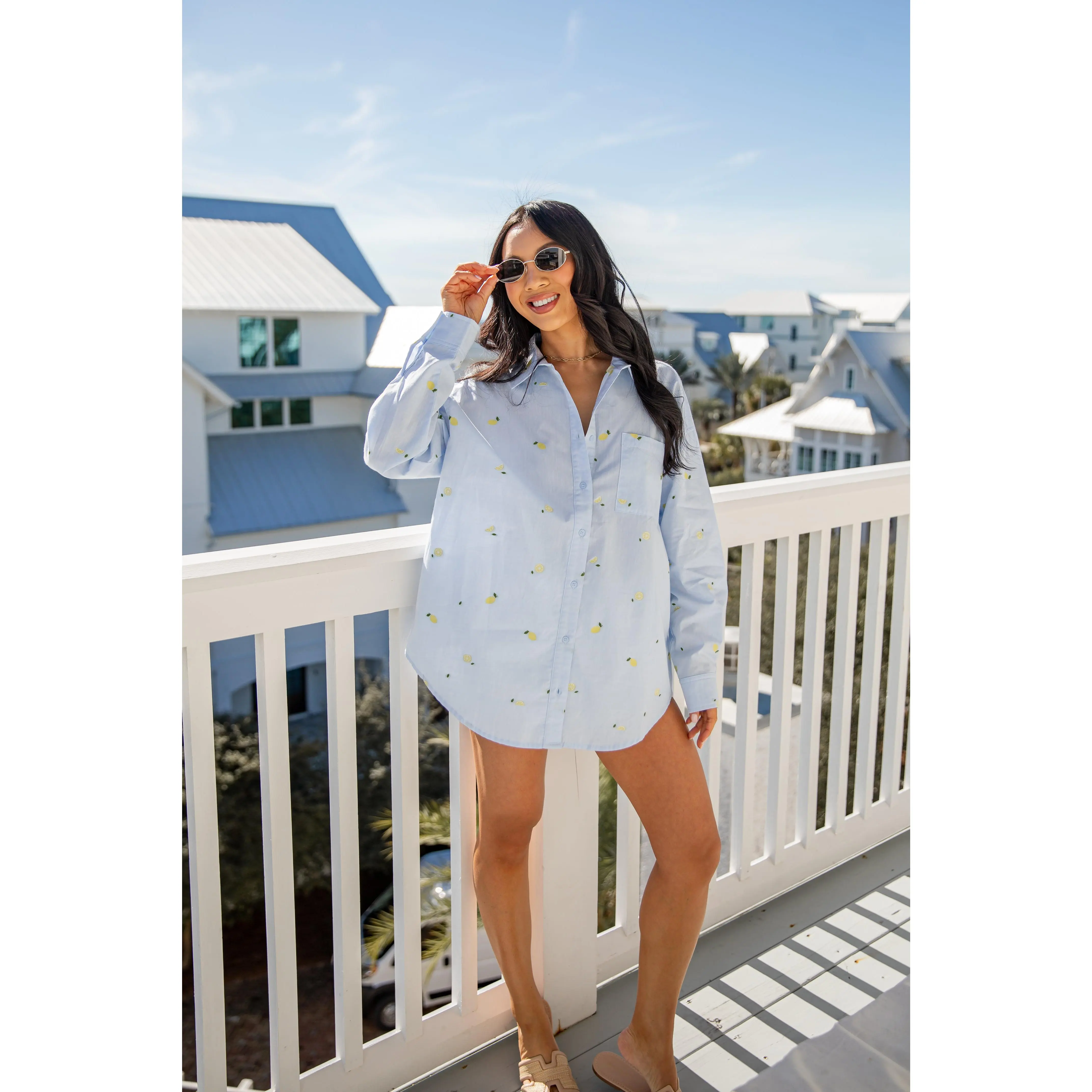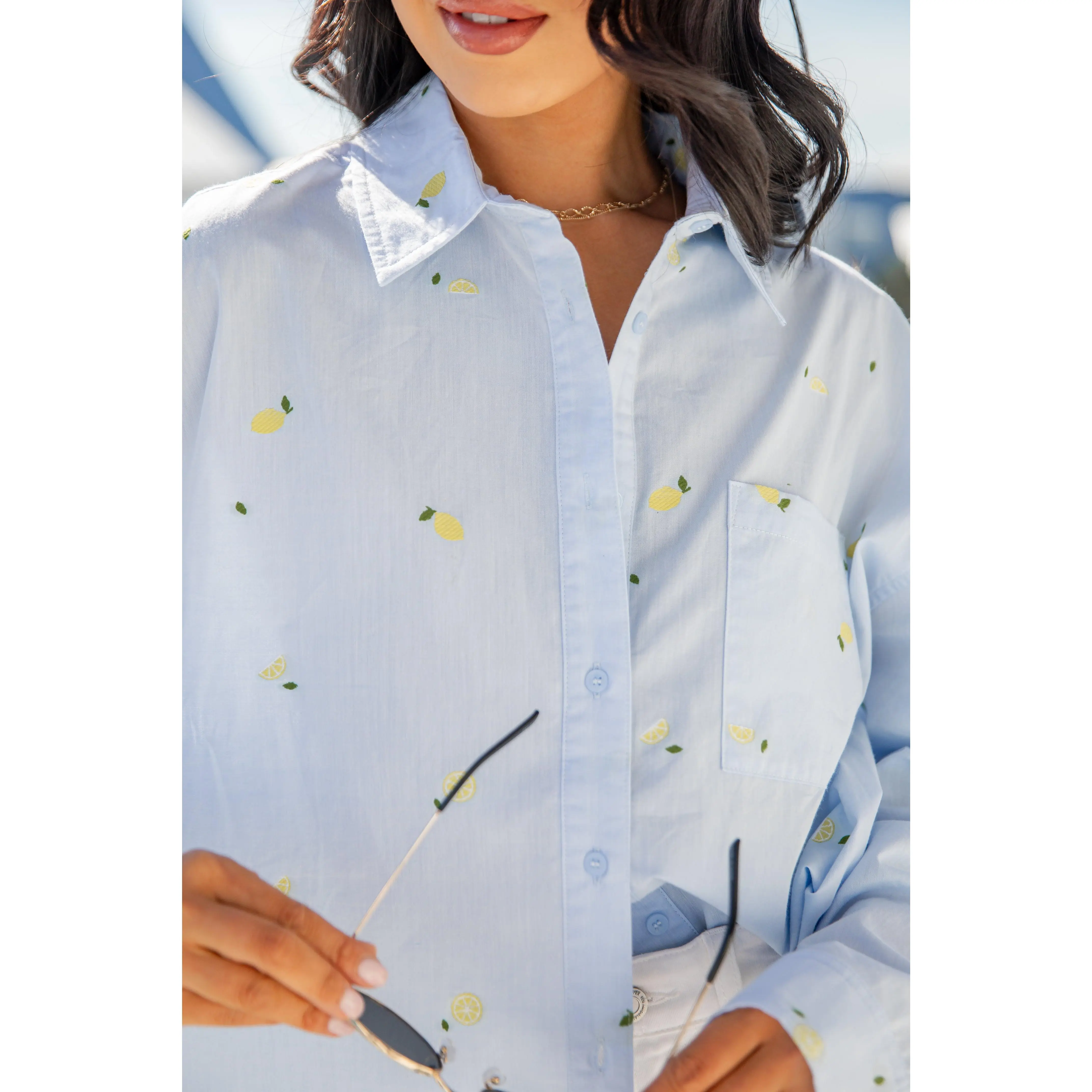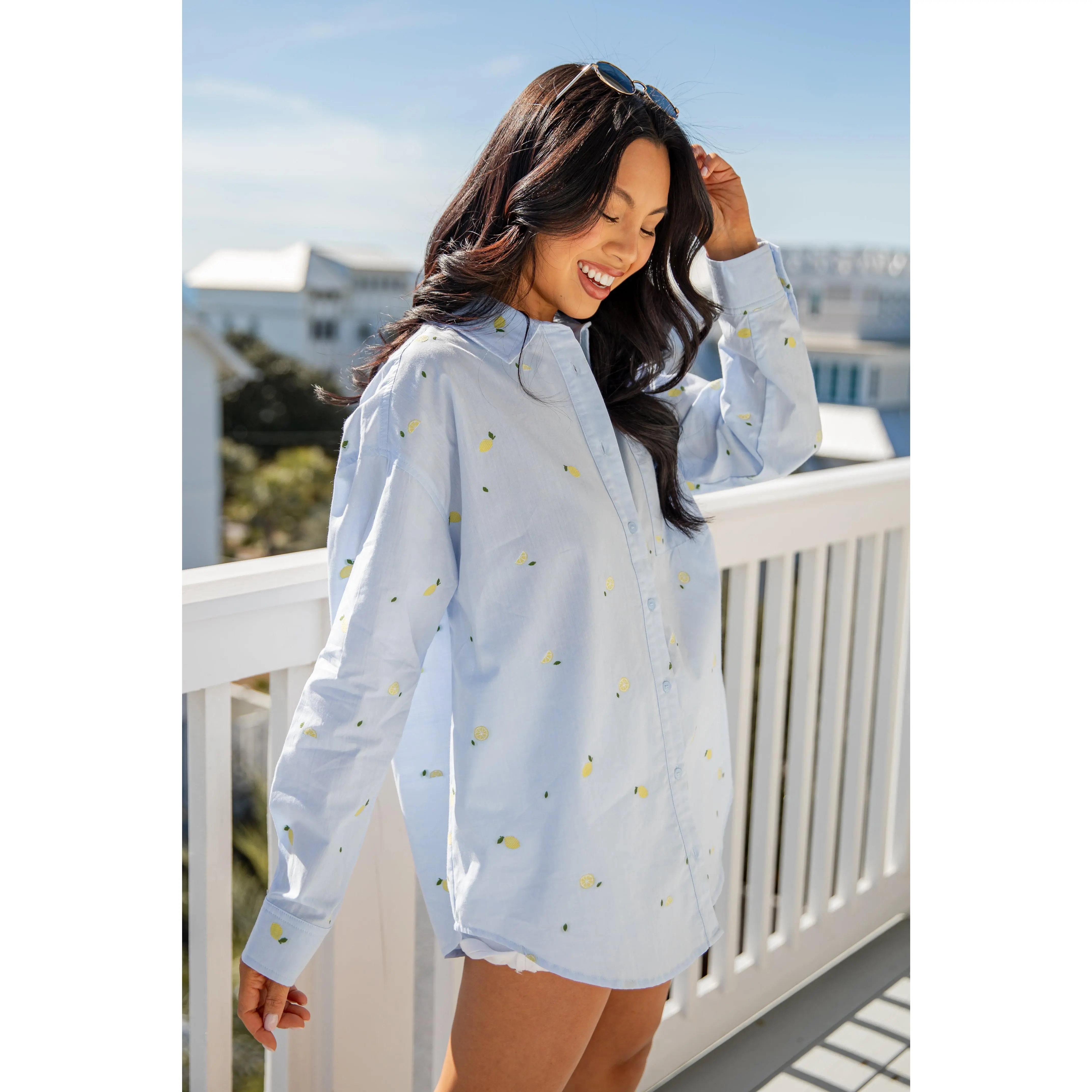The Lemon Drop Embroidered Button-Down adds a fresh, playful touch to a classic silhouette. Featuring delicate embroidered detailing throughout, this lightweight woven shirt is designed with a relaxed fit, classic collar, and button-front closure. Easy to style and endlessly versatile, it pairs perfectly with denim or tailored bottoms for a refined spring-ready look.