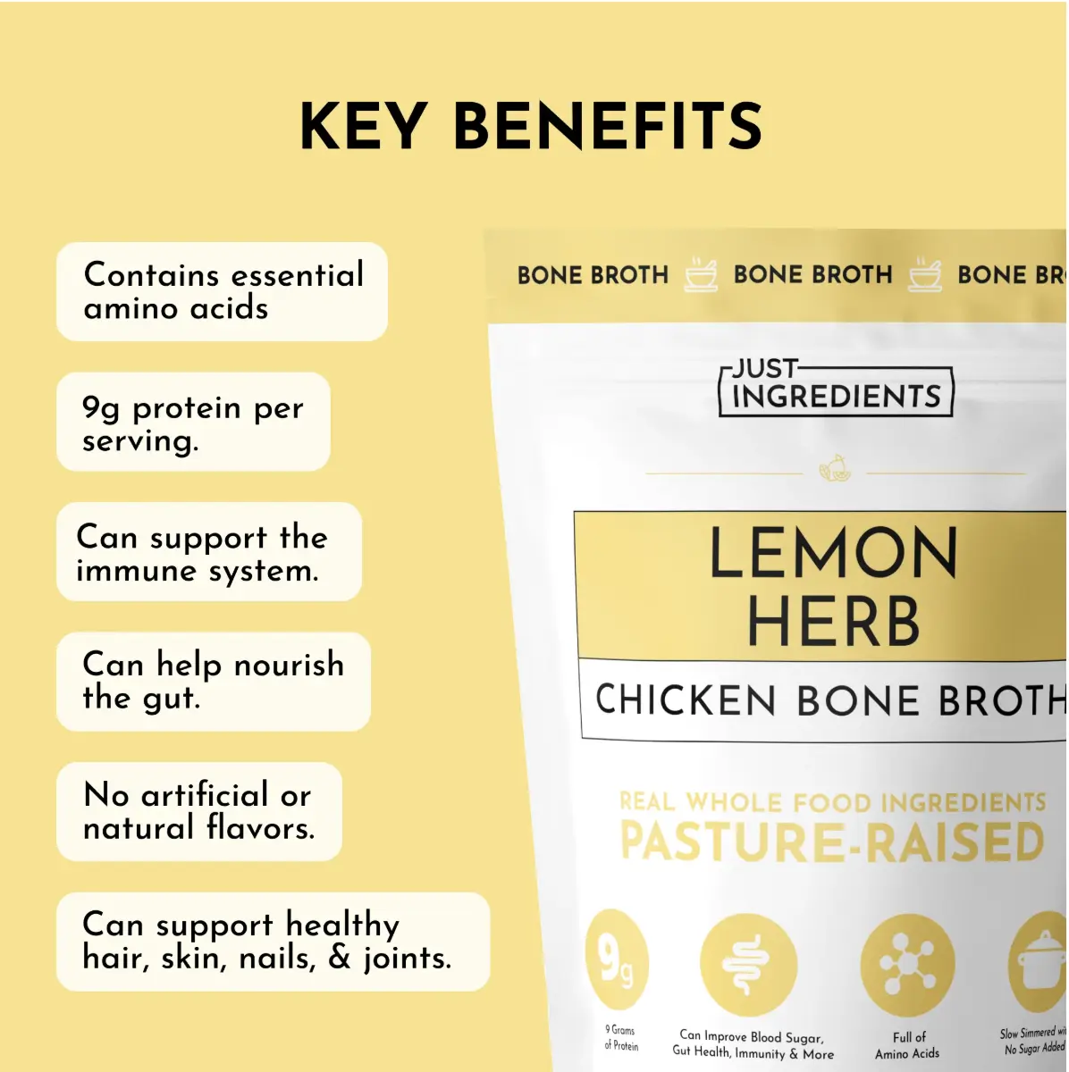 This bone broth is unique in its powdered form, however, when it is bloomed in warm water, it makes a wonderful way to receive nutritious sustenance, particularly in times of illness. The broth has a strong and rich lemon flavor, and it is a perfect pairing for something like rice or a sauce.