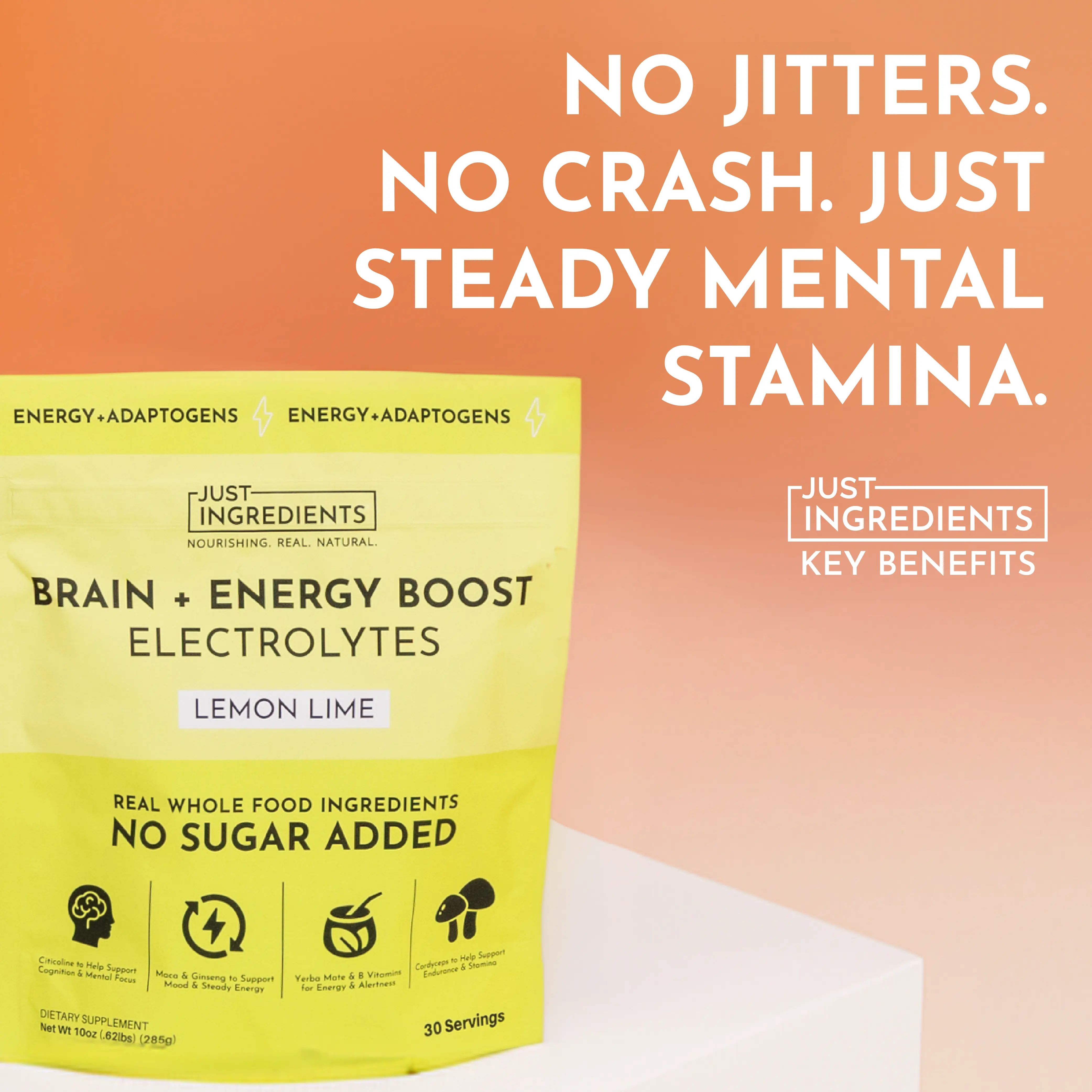 Not your typical energy drink. Just Ingredients Lemon Lime Brain & Energy Boost + Electrolytes is thoughtfully formulated to support your body’s normal energy systems — not just deliver a quick caffeine spike. With an energy blend, adaptogens, and nootropics, it helps fuel both mind and body for sustained focus, mental clarity, and improved hydration.