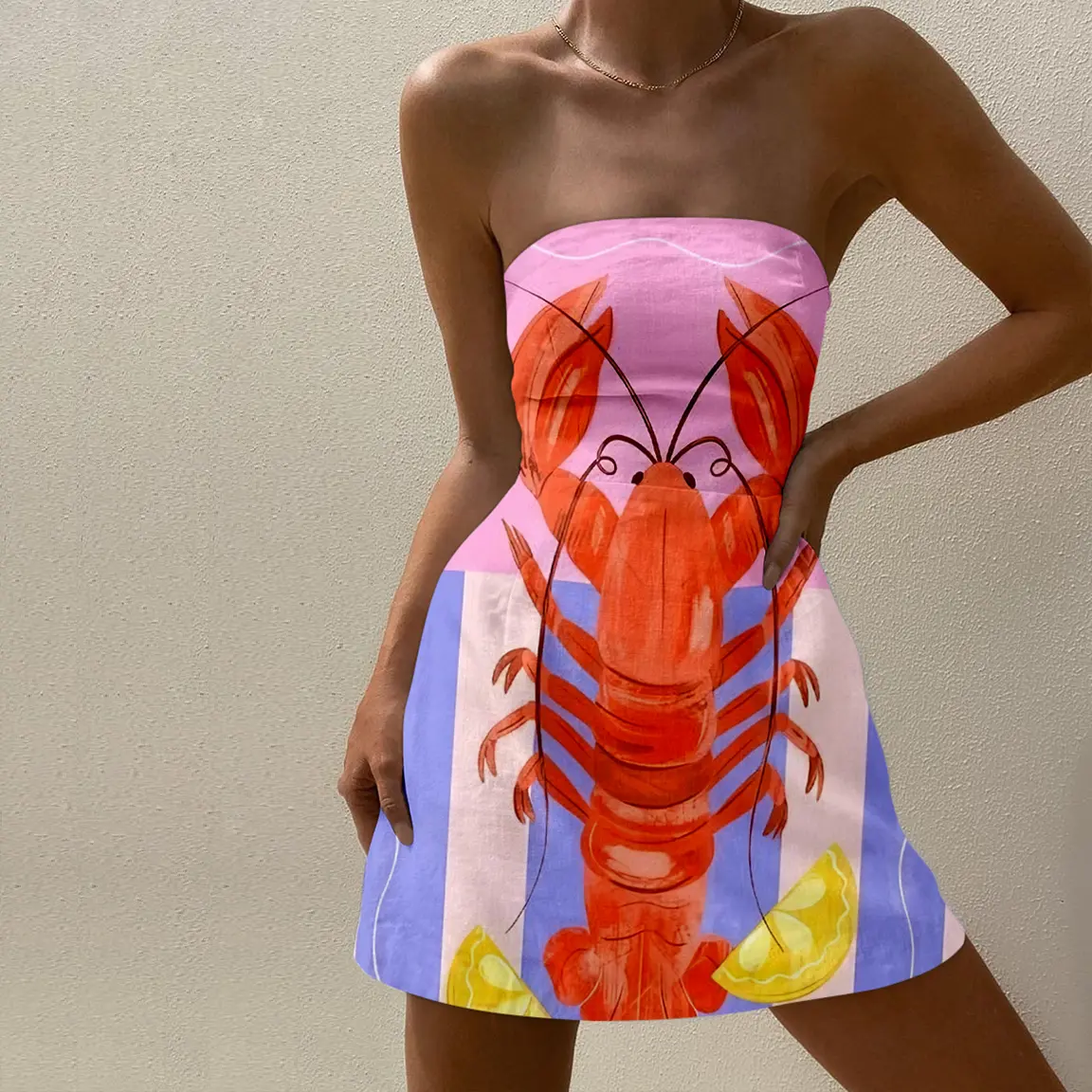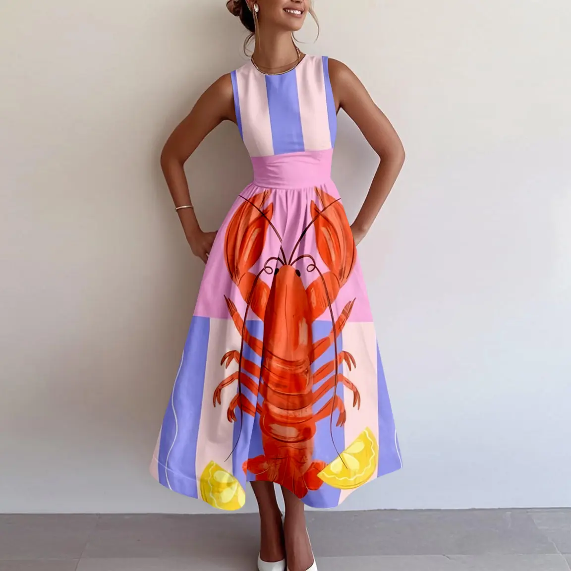 Versatile Style-The central red lobster is depicted using realistic watercolor techniques, but the overall outline is deliberately enlarged to occupy 70% of the skirt's area, creating a surreal visual tension. The background is light in color and contrasts with the highly saturated orange-red hue, while the lemon slices at the bottom echo the seafood theme.
