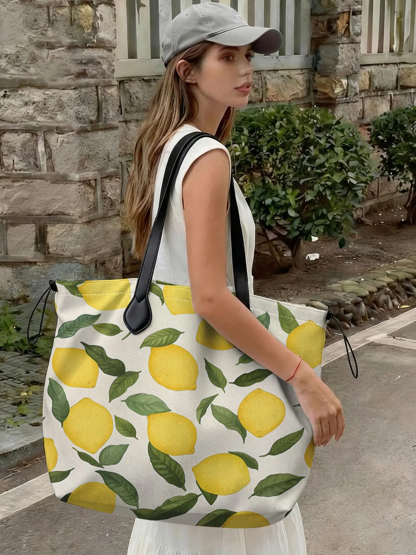5. Lemon Pattern 2D Printed Drawstring Tote Bag, Large Capacity Shopping Bag, Durable and Wear-Resistant, Ideal for Work, Shopping, Picnic