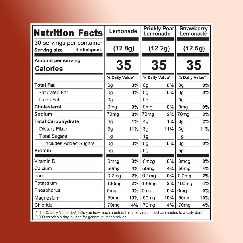Collagen (Grass-fed), Inulin (from chicory root), Crystallized lemon (Non-GMO citric acid, lemon oil, lemon juice), Prickly Pear, Potassium Citrate, Magnesium Hydroxide, Calcareous Sea Algae, Unrefined Sea Salt, Lemon Extract, Steviol Glycosides