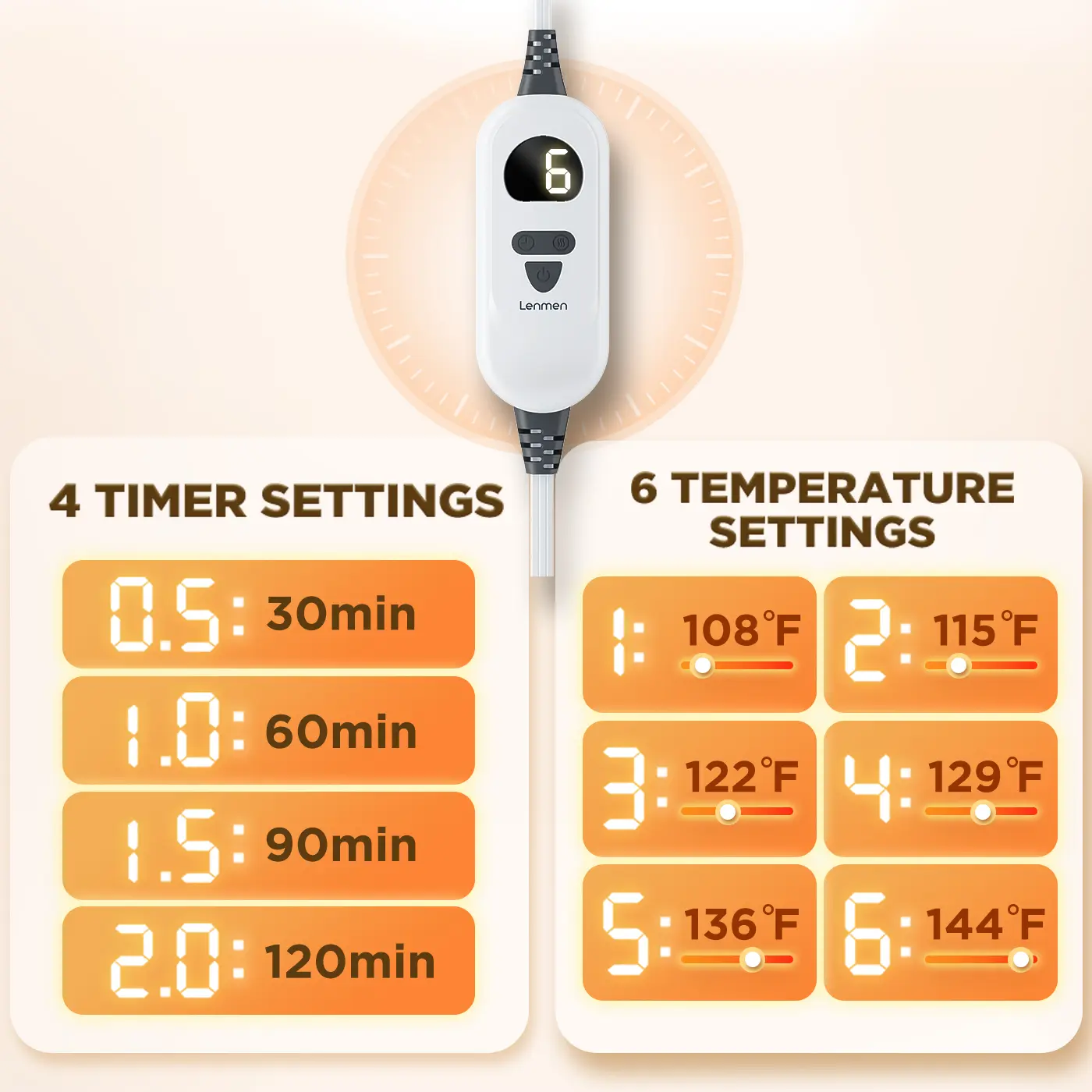Featuring a 354" extended heating coil, this pad has a better heating effect, ensuring even distribution within a minute. Choose from 6 temperature settings (108℉ to 144℉) and 4 auto-off timer options (0.5 to 2 hours) to customize your comfort. The soft micro plush flannel fabric is machine-washable for easy cleaning.