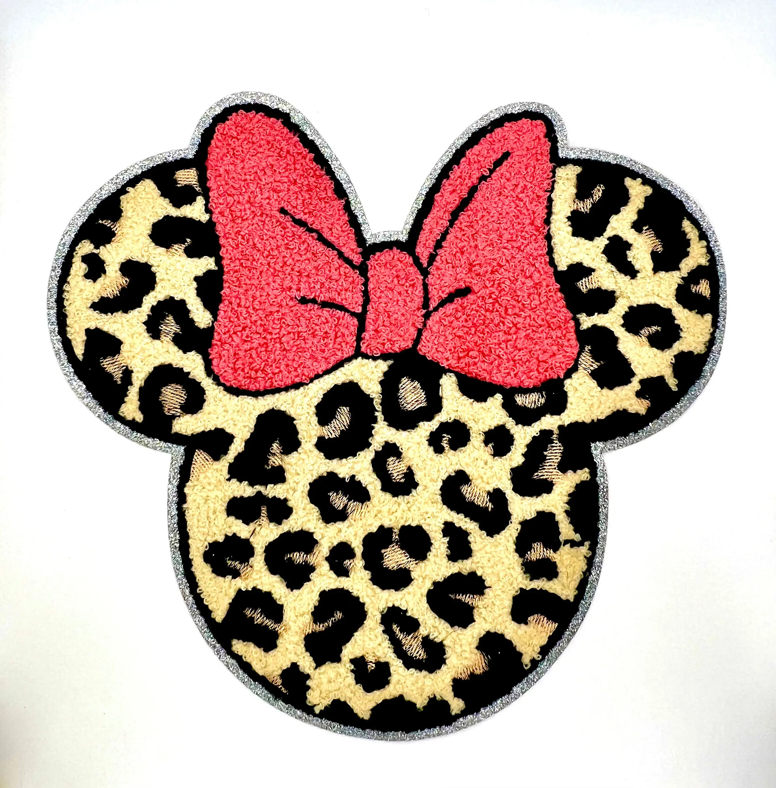 This eye-catching leopard mouse head patch features a plush chenille texture, rich black and golden leopard print, and a vibrant pink bow that adds the perfect pop of personality. Finished with a sparkly silver embroidered edge, this patch is made to stand out.