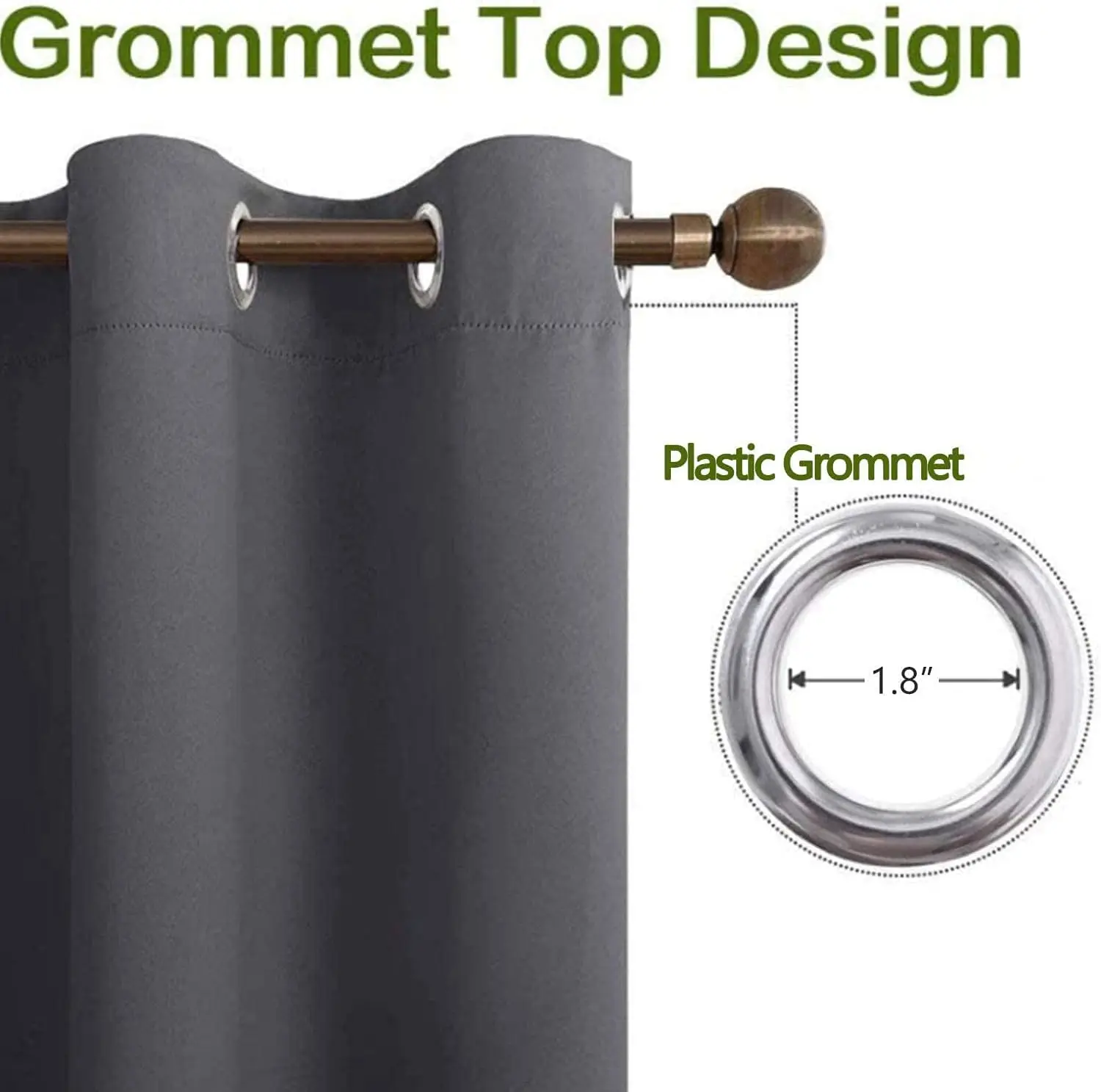 Curtain Size: 38"x45"x2 panels or 38"x54"x2 panels or 42"x63"x2 panels or 42"x84"x2 panels or 42"x90"x2 panels or 52"x63"x2 panels or 52"x84"x2 panels or 52"x90"x2 panels or 52"x96"x2 panels . Plastic grommets on top(Inner diameter1.8" and Outer diameter 2.7").Easy to hang, and slide smoothly.