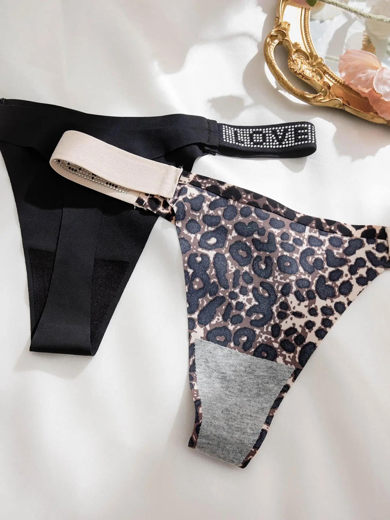 【Stylish Design】: Elevate your underwear game with the chic leopard and letter print, adorned with sparkling rhinestones, making it a fashionable statement for the style-conscious woman.