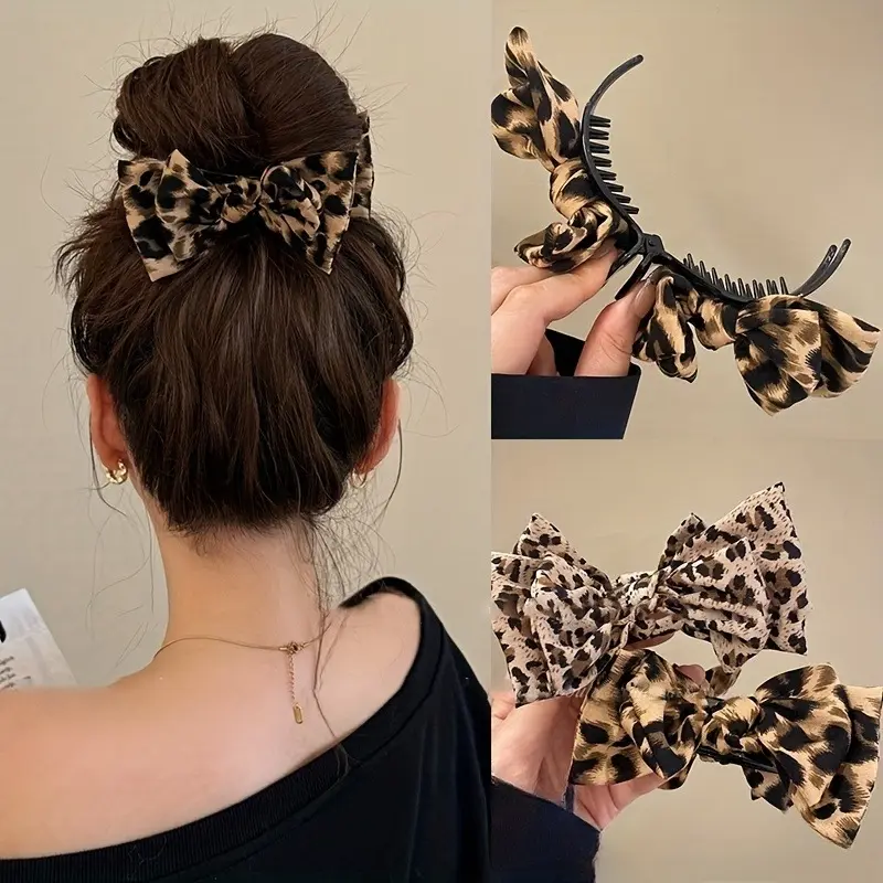 Elevate your everyday look with this leopard print bow hair claw clip. Designed in a vintage style with a secure shark clip, it combines fashion and function—perfect for keeping your hair neatly styled while adding a bold touch of personality.