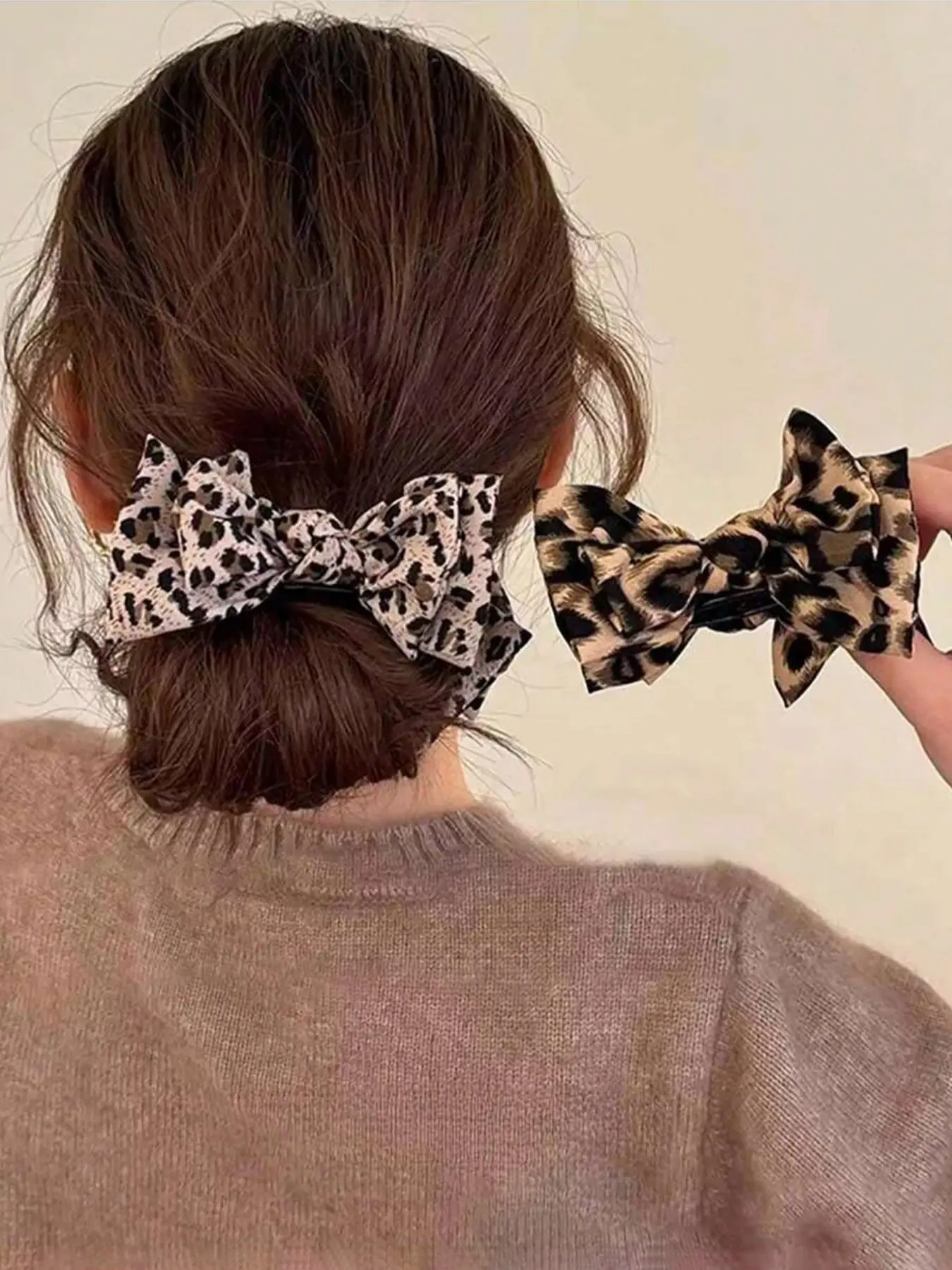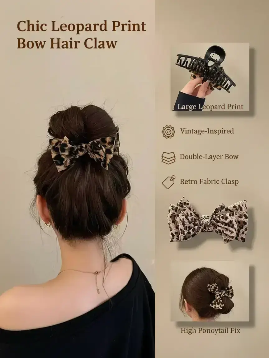 5. 1PC Chic Leopard Print Bow Hair Claw Clip, Elegant Double-Layer Big Bow Hair Clip, Vintage-Inspired Fabric Hair Accessory for High Ponytail and Daily Wear