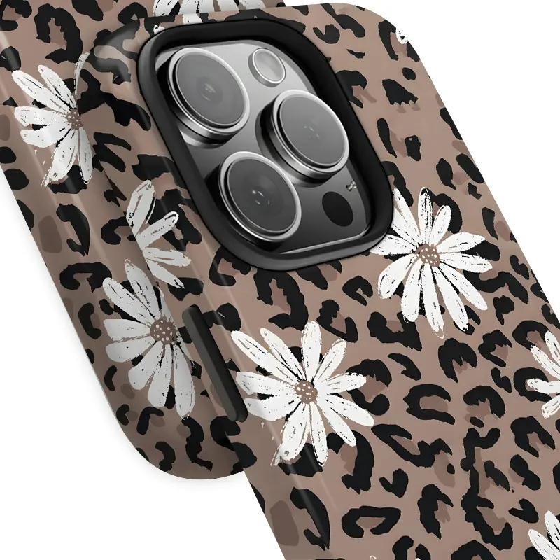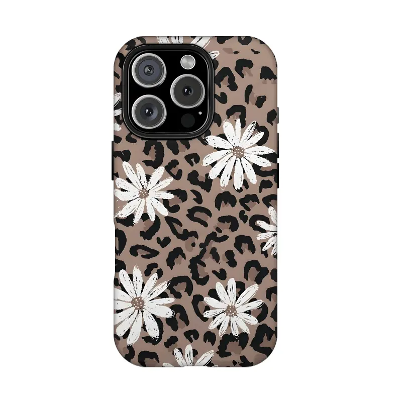 Leopard print daisy pattern, durable and shock-absorbing glossy 2-in-1 phone case, suitable for iPhone 17 16 15 14 13 12 11 X, Samsung and other series models, can be given as a holiday gift to friends or home