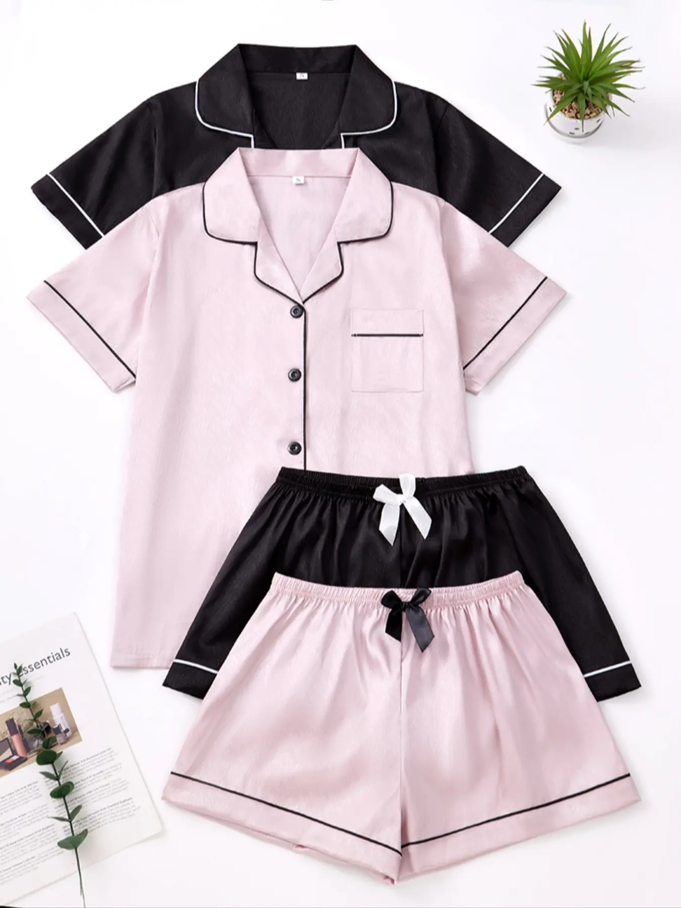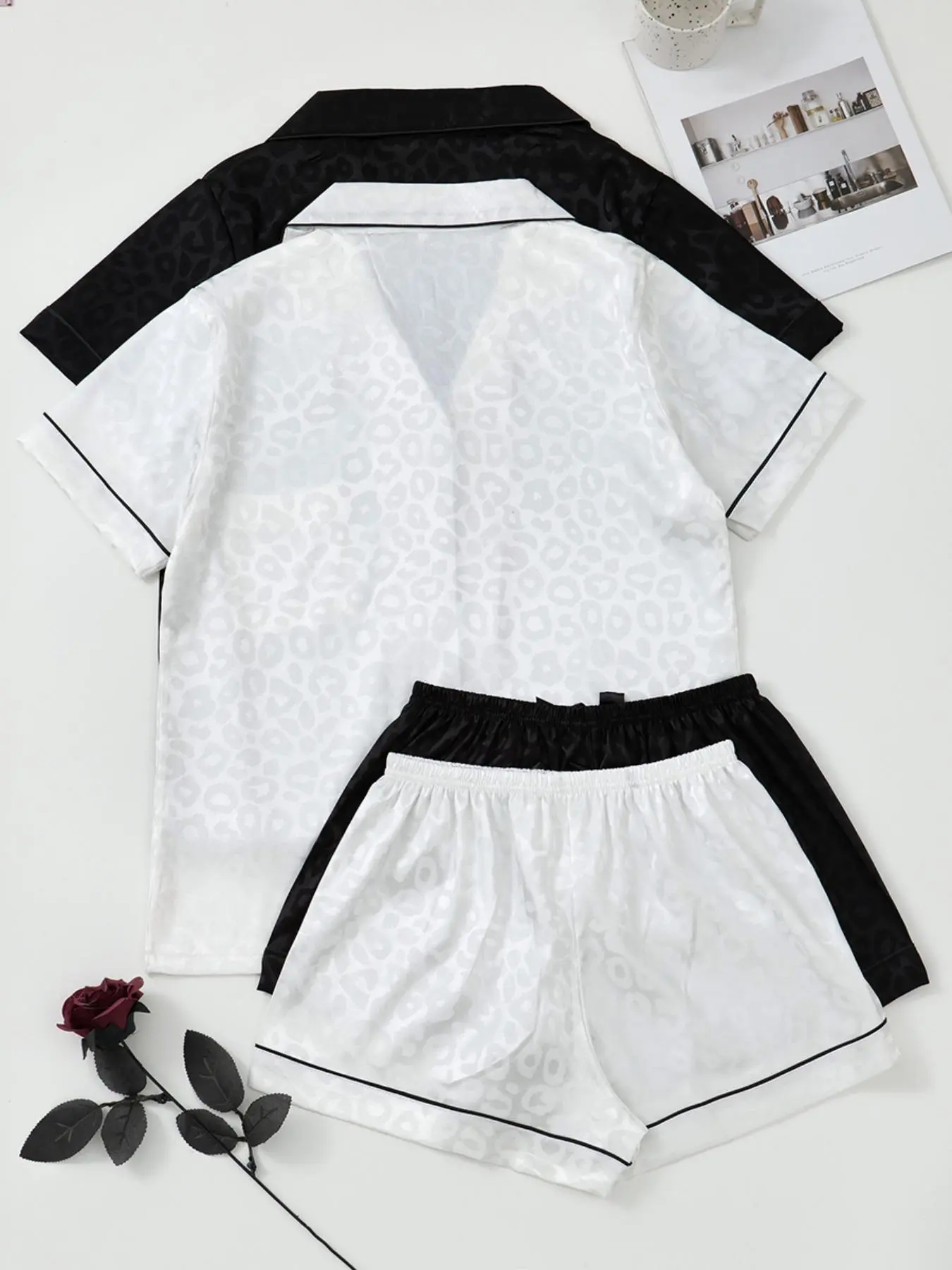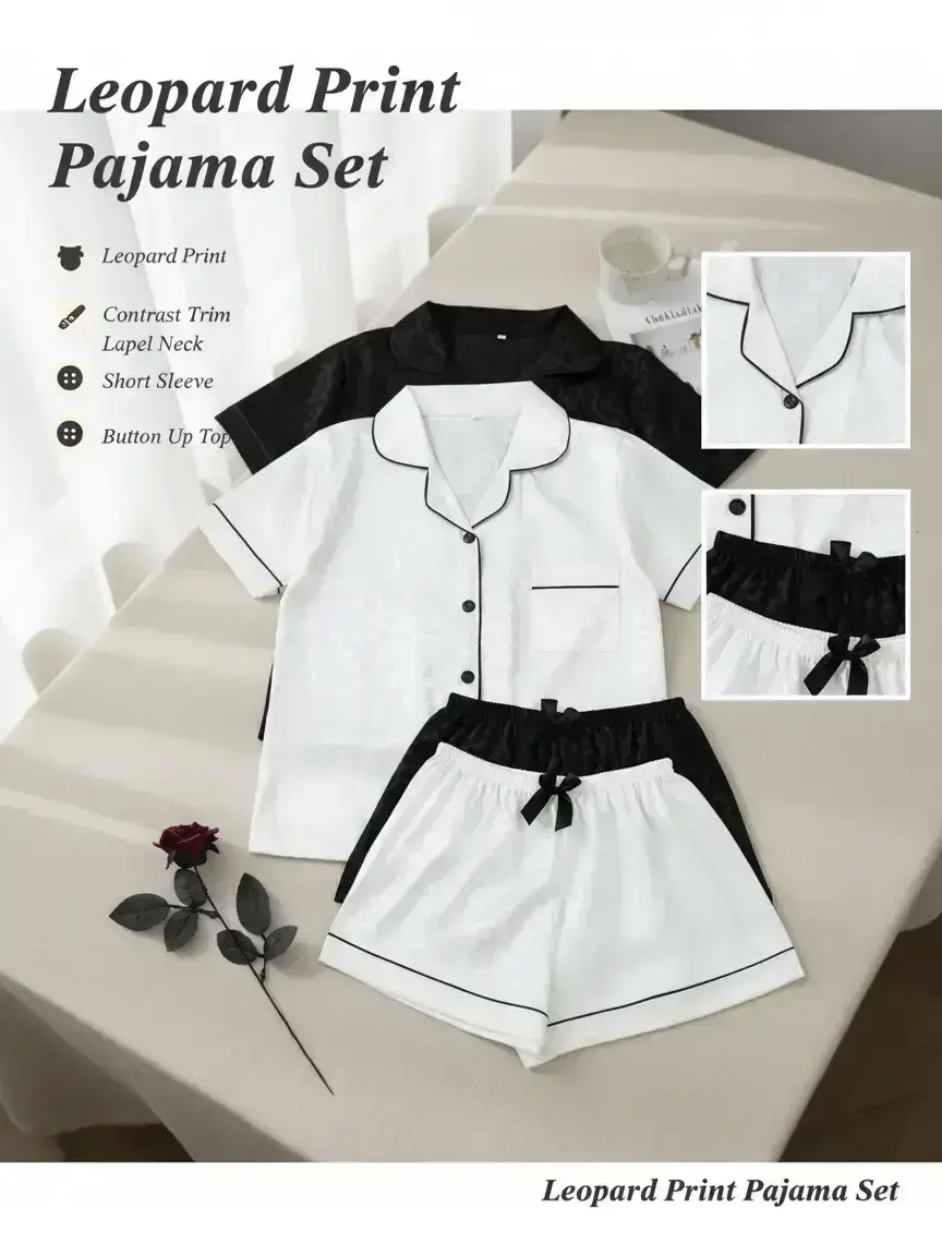 Women's Leopard Print Contrast Trim Lapel Neck Pajama Two-Piece Set, Comfort PJ Set, Short Sleeve Button Up Top & Shorts PJ Set, Casual Sleepwear Set for Women #pjset #cozyloungewearset #womenspjs #curvytwopieceset #relaxedfitwomensset #sweatpantsset #womenpajamaset #cottonpajamas #womenssets #linenpajamas