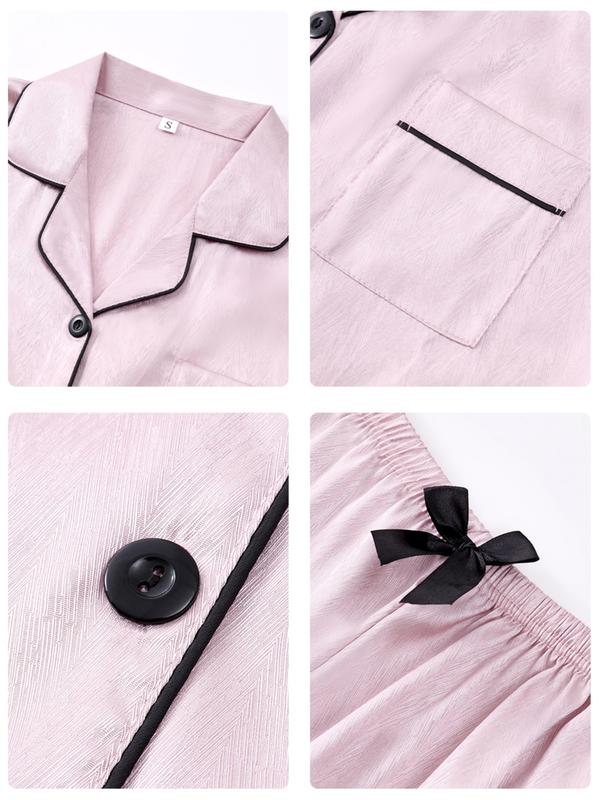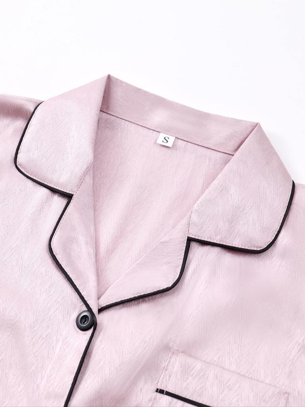 Women's Leopard Print Contrast Trim Lapel Neck Pajama Two-Piece Set, Comfort PJ Set, Short Sleeve Button Up Top & Shorts PJ Set, Casual Sleepwear Set for Women