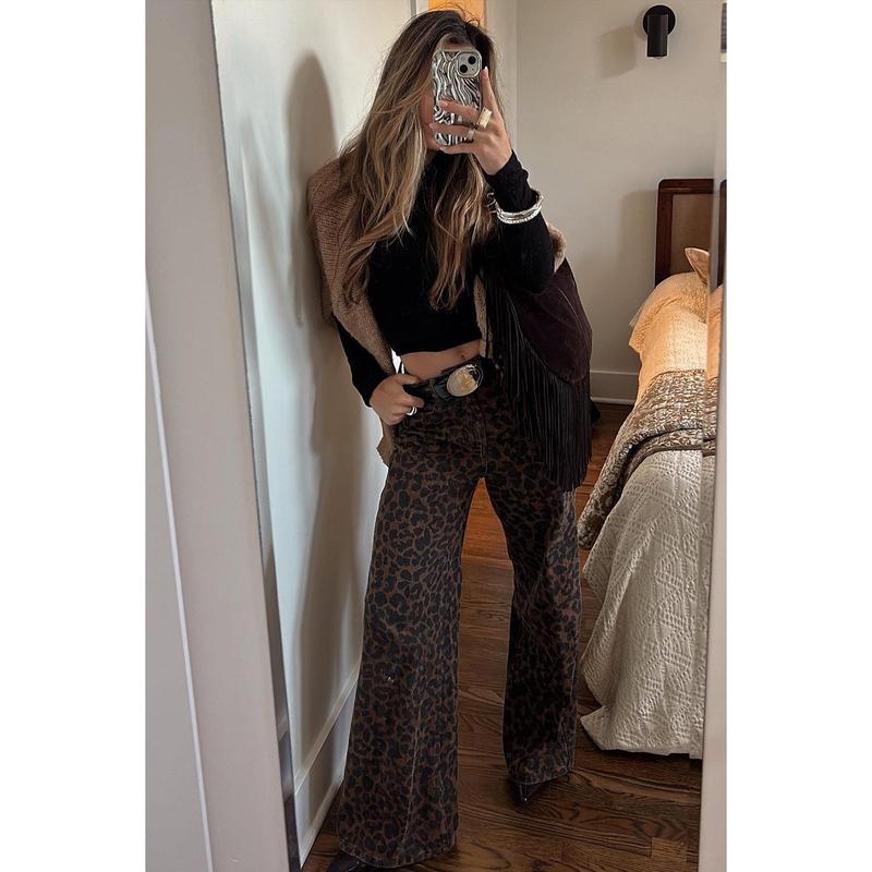 Kris Leopard Print Flare Jeans – High Waisted 70s Retro Style Bell Bottom Denim