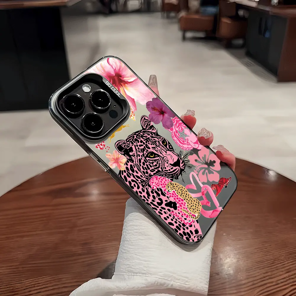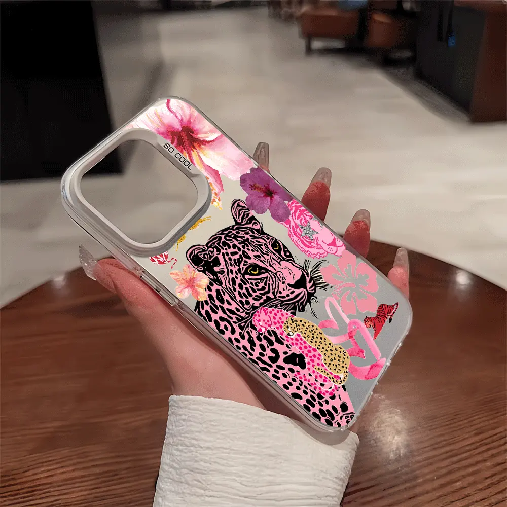 Leopard-print tiger and floral pattern design, full-coverage fashion phone case in colored silver. Compatible with Apple iPhone 17/16/15/14/13 Pro Max and Samsung Galaxy S25/24/23 Ultra series models.