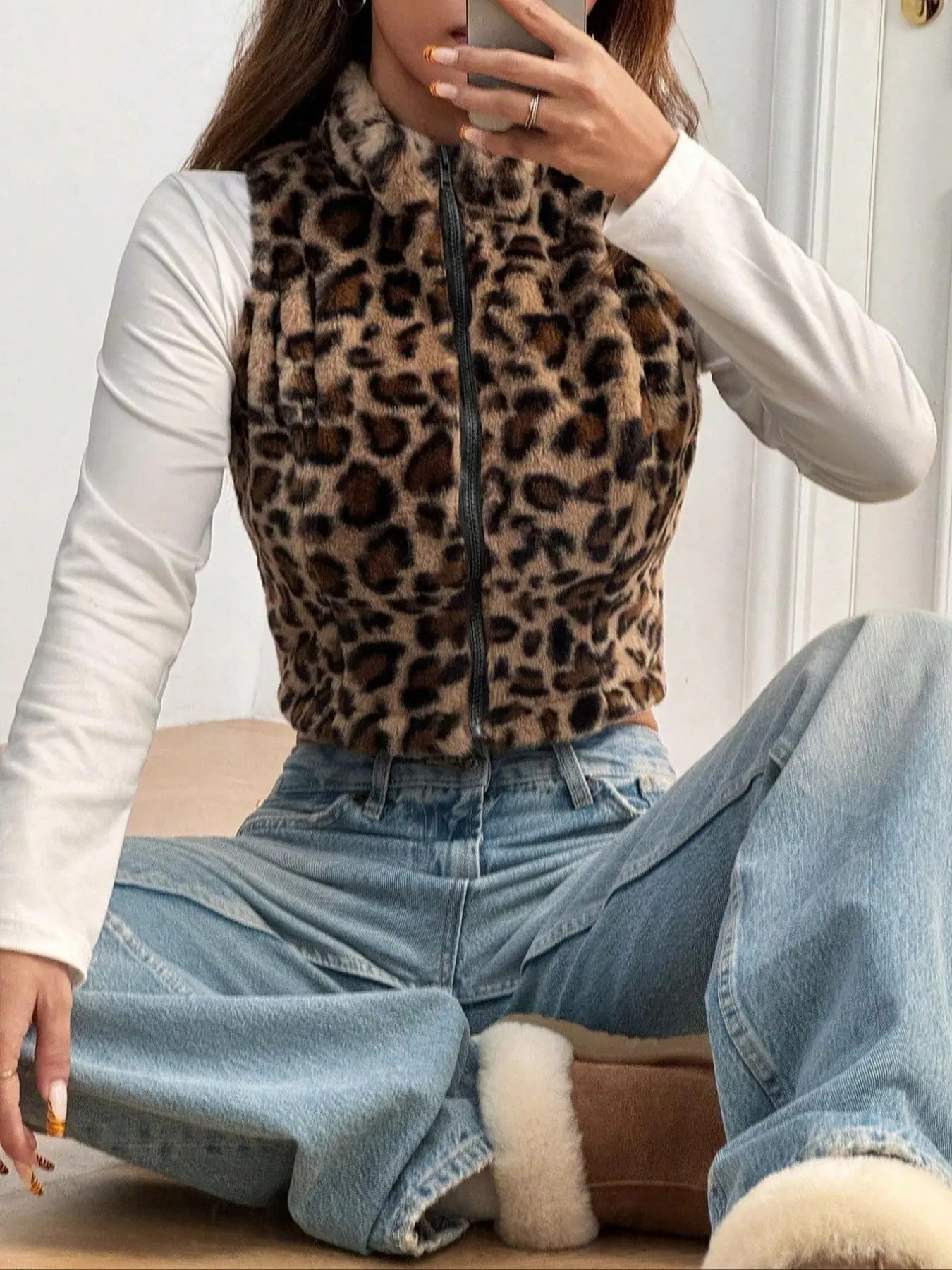 Women's Leopard Print Zip Up Crop Vest Jacket, Casual Sleeveless Stand Collar Soft Plush Outerwear for Fall & Winter, Ladies Clothes for Daily Wear