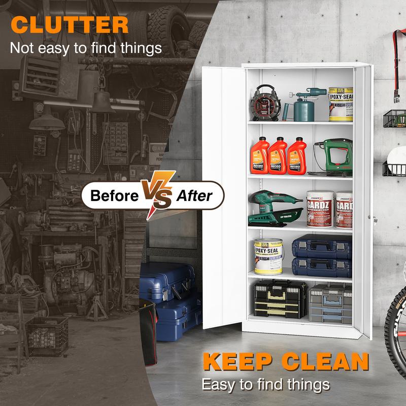 ·【Practical Design】Each door has 2 magnetic devices to ensure that the door is tightly closed;Two reserved holes on the back panel can be fixed on the wall; Metal cabinet with 5 adjustable shelves,6-floor storage space suitable for a variety of storage applications,improve space utilization by 80% compared to 4-layer cabinets.