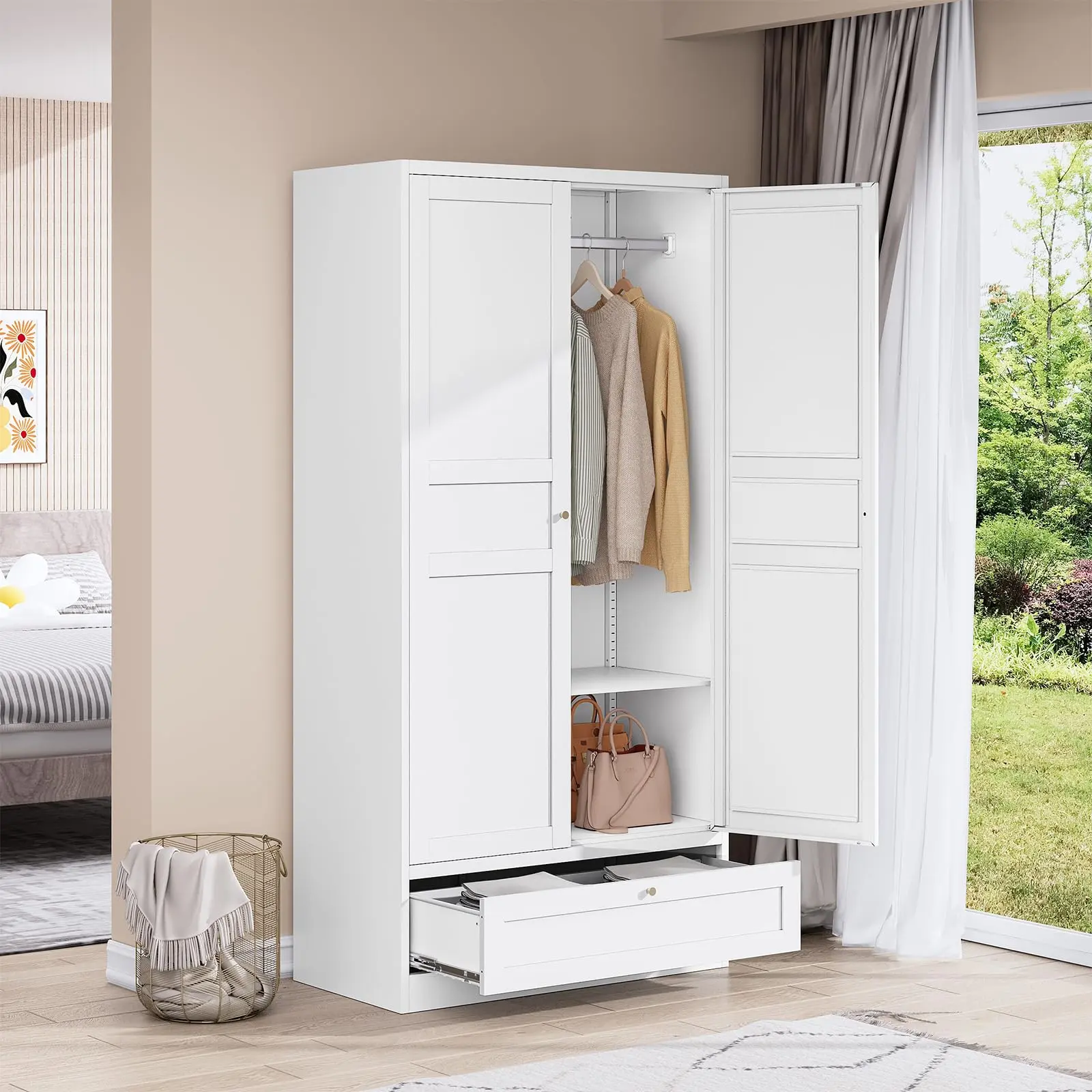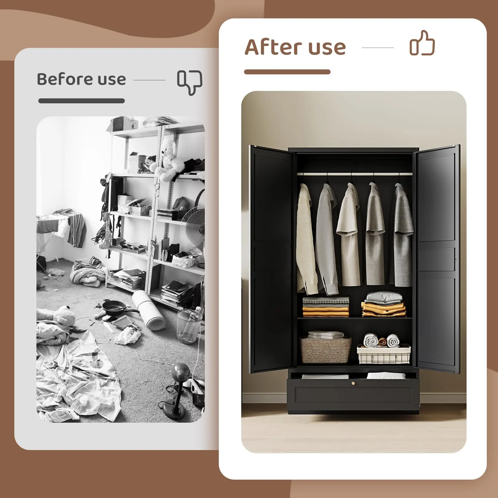 ·【Stable and Reliable】Two sturdy magnetic caps are installed on the wardrobe door to ensure safe closing and keep items from being affected by dust. The wardrobe is also designed with an anti-tilt mechanism, with pre-drilled holes on the back to facilitate secure wall installation and prevent unintentional tilting.