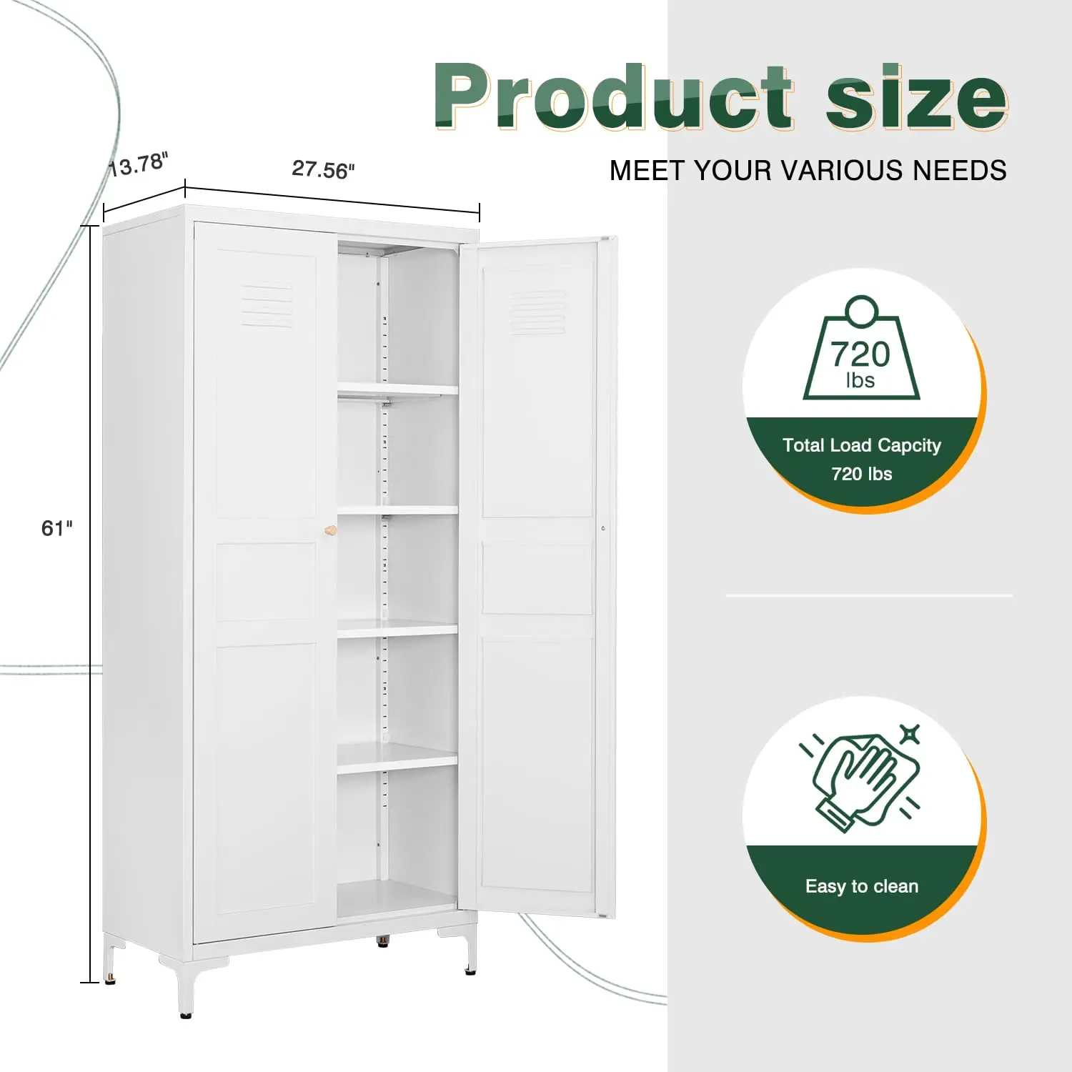 ·【Practical Design】Each door has 2 magnetic devices to ensure that the door is tightly closed;Two reserved holes on the back panel can be fixed on the wall; Metal cabinet with 4 adjustable shelves,5-floor storage space suitable for a variety of storage applications,improve space utilization by 80% compared to three-layer cabinets.
