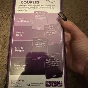 This game looks like so much fun I already looked at some of the cards and they get so personal and deep. I can not wait to play this with my boyfriend!!!