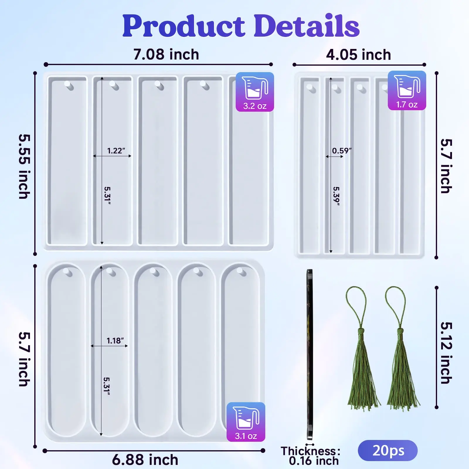 ·【Product Size Details】:Small rectangle: 5.39''x0.59'',medium rectangle: 5.31''x1.22'', curved edge: 5.31''x1.18''. Full filling, and the thickness can reach 0.16'', If you prefer a thinner bookmark, you can only fill it halfway.
