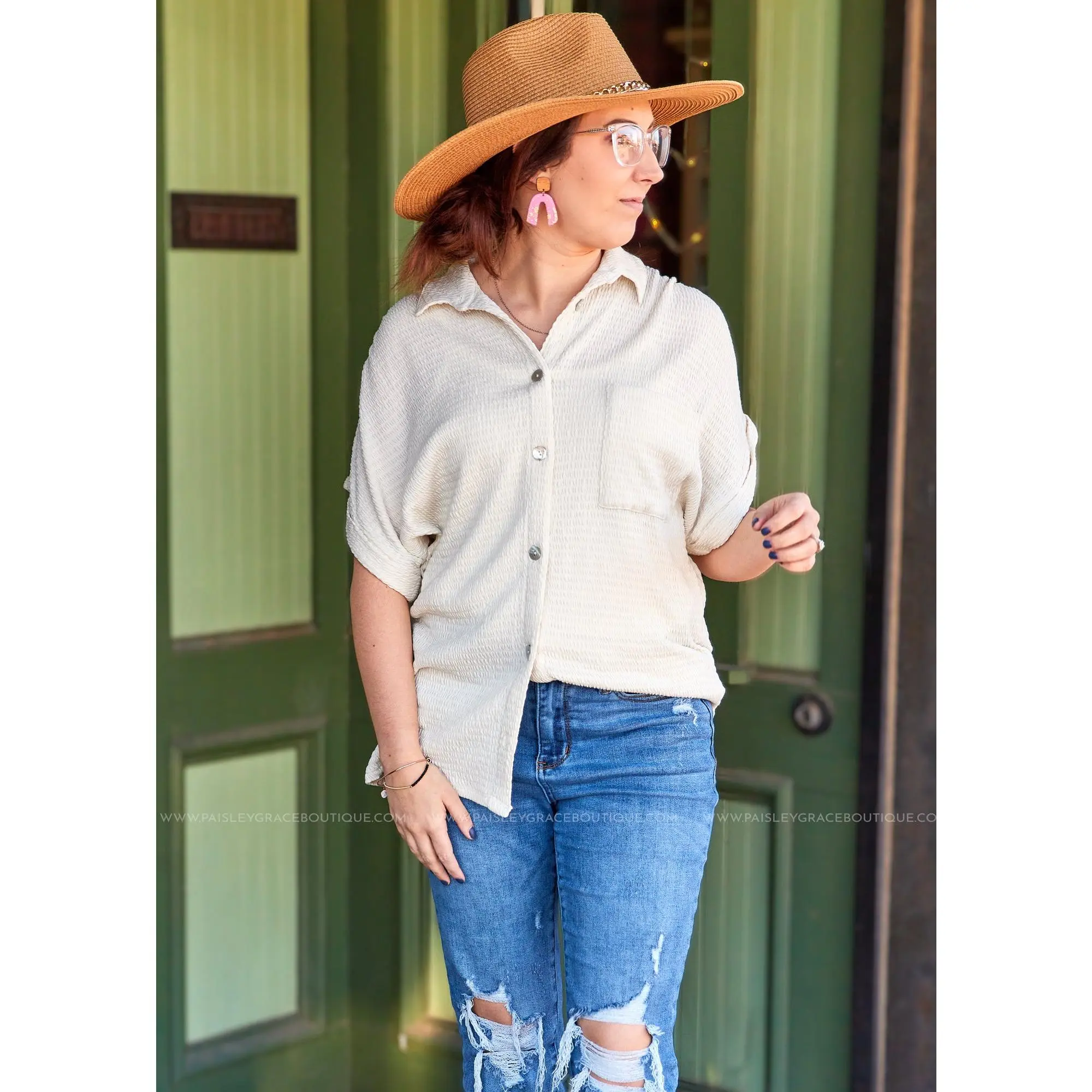 ·Collared Neckline | Short Dolman Sleeves | Curved Hemline
