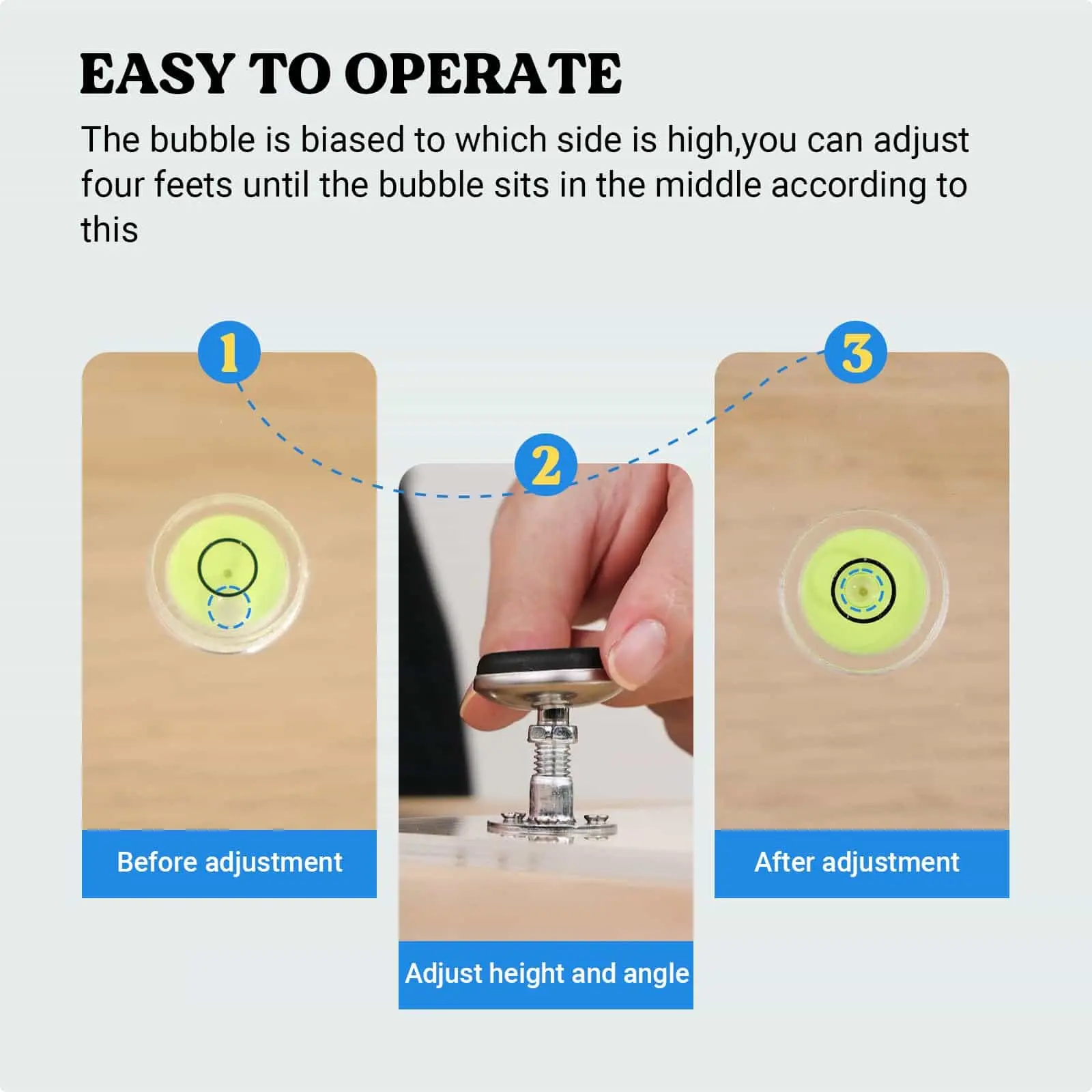 ·No Installation Required: This leveling board does not require installation, is simple to use, and does not require complex steps, or even the use of tools. Simply adjust the four feet by hand until the bubbles in the black circle sit in the center position. To save you time and allow you to focus on your resin creation. Note: During the adjustment process, if the bubble is biased to one direction, it indicates that this direction is relatively high and lower this height.