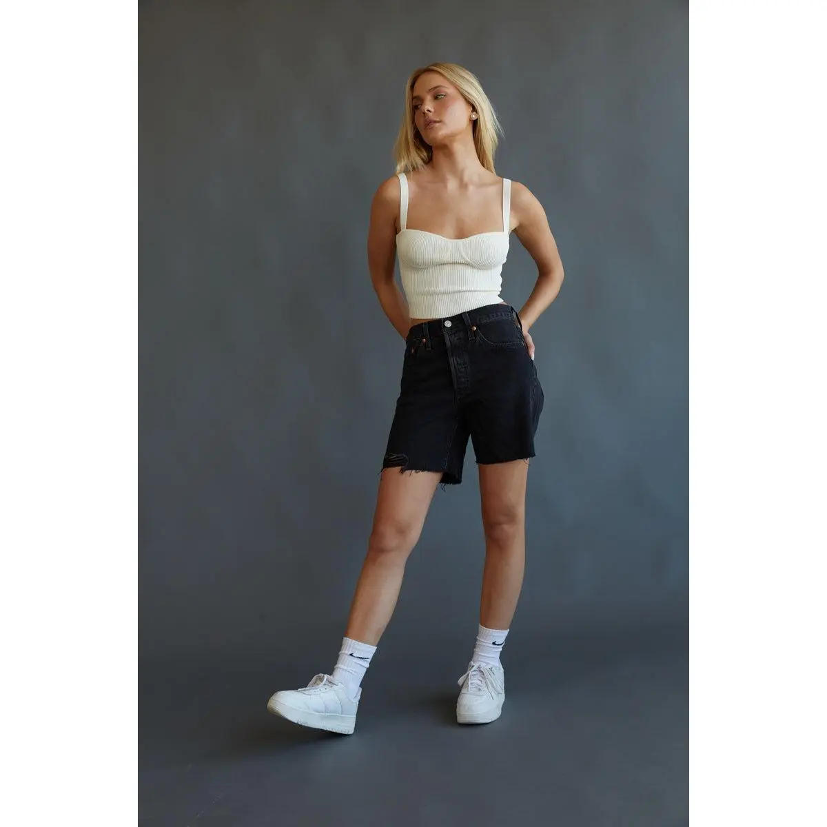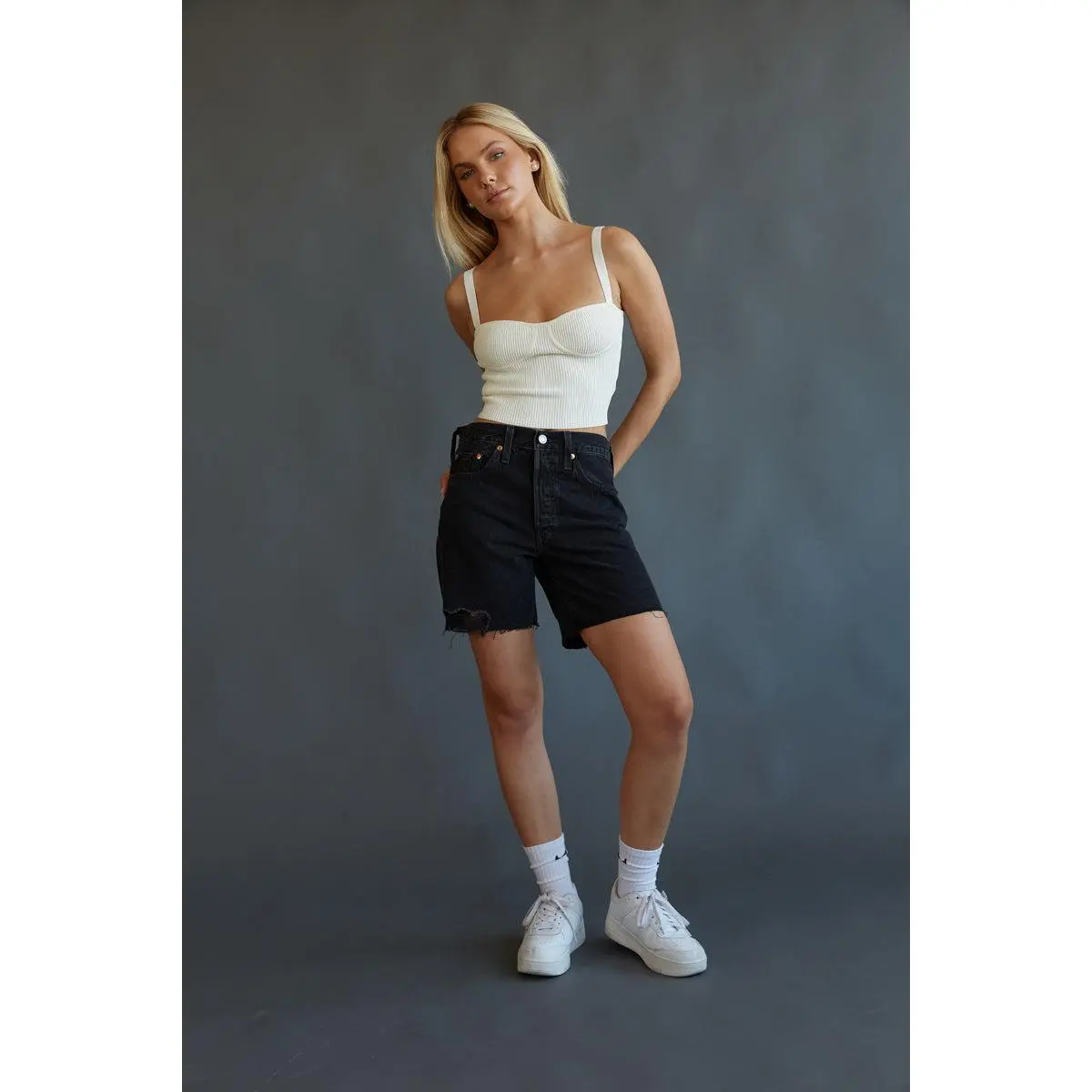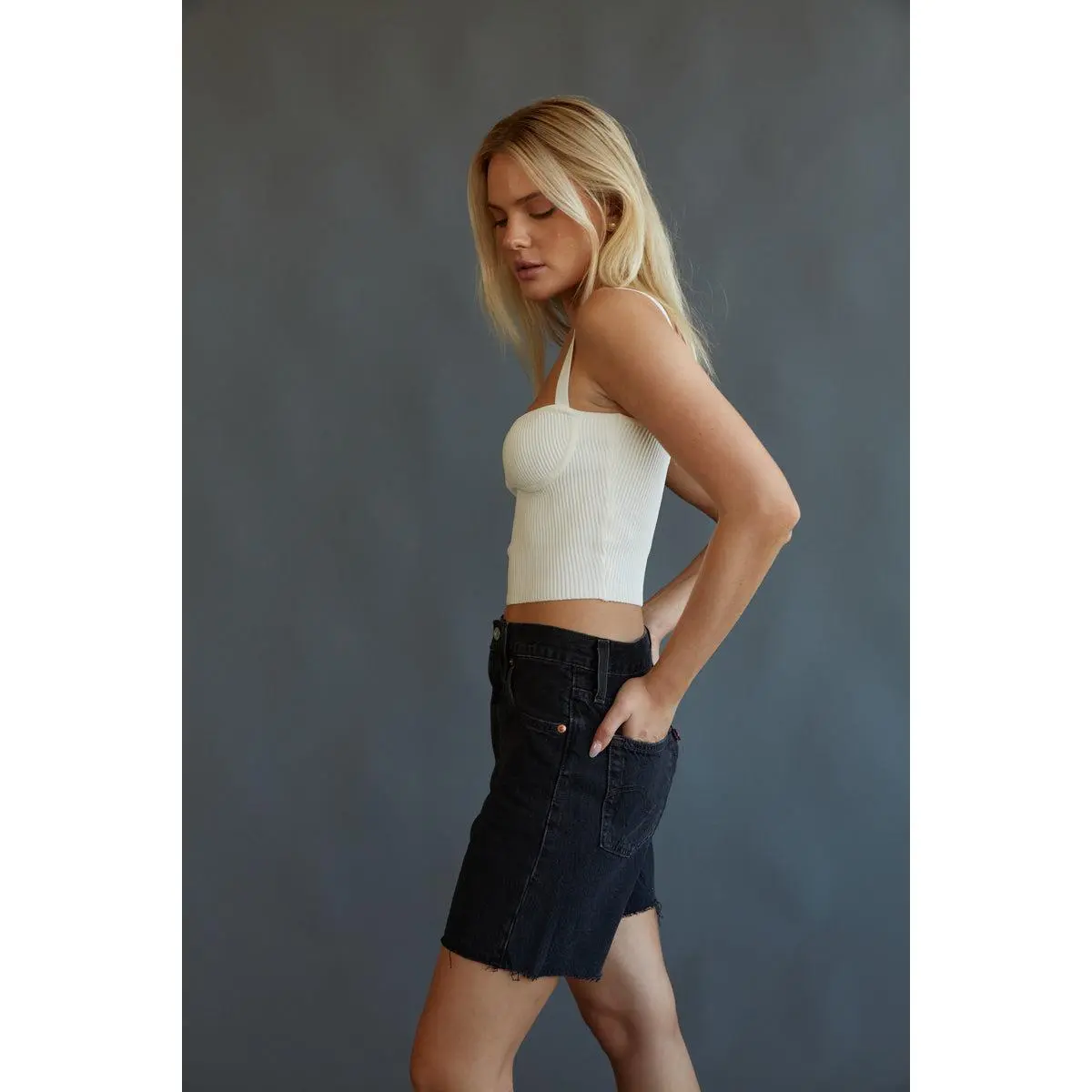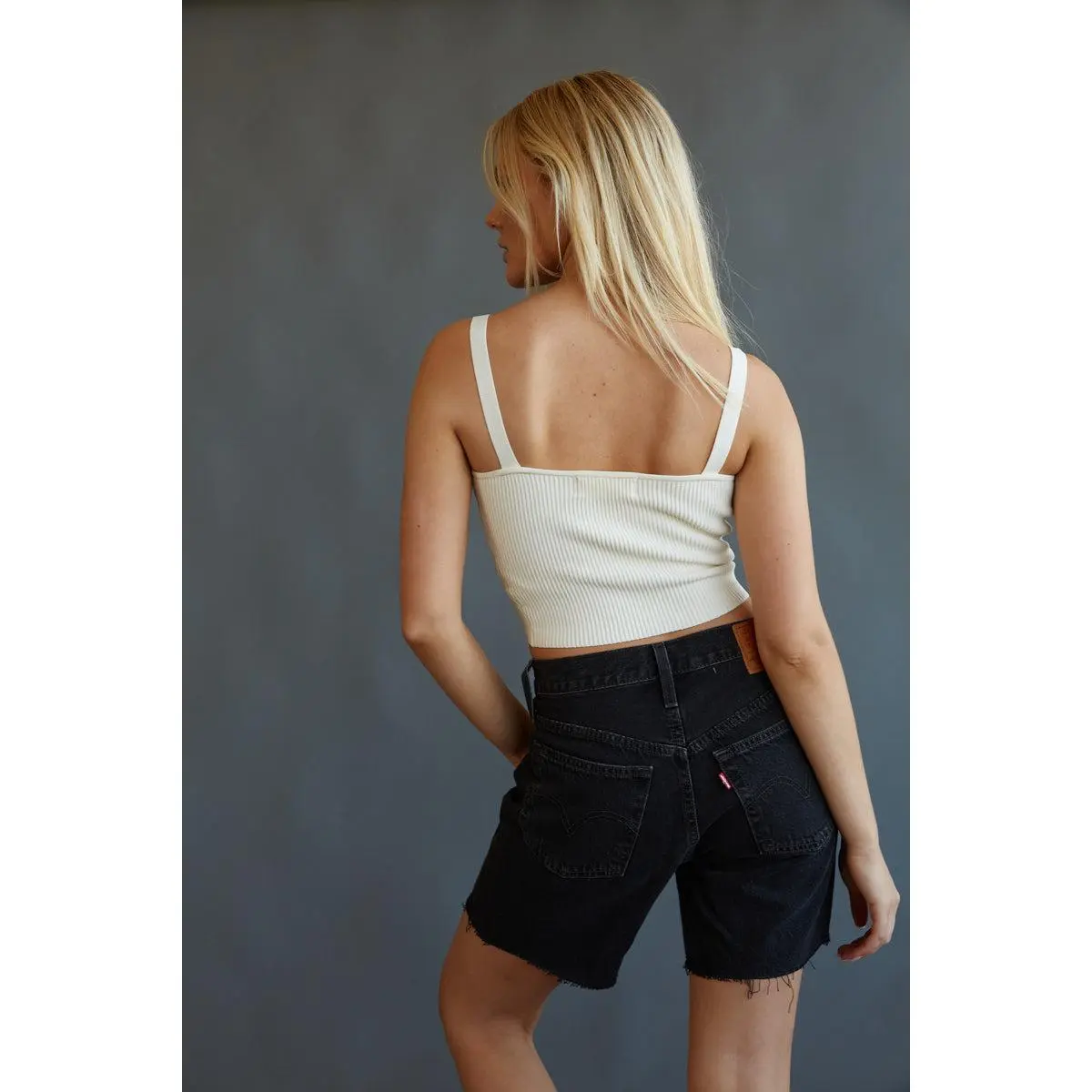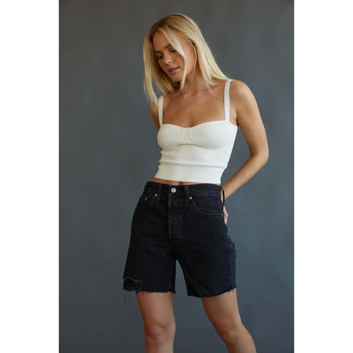 The Levi's 501 Mid Thigh Shorts offer the classic fit of your 501s with a little added length! These denim shorts are easy through the hips and feature a high waist, five pocket styling, and frayed raw hems. Pair with Jacqueline Cropped Knit Tank Top to complete the look!