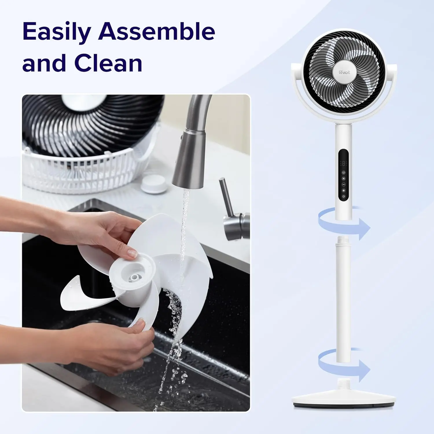 Quickly dismantle parts for thorough cleaning and reassemble in under a minute. Easy assembly and cleaning make this fan user-friendly.