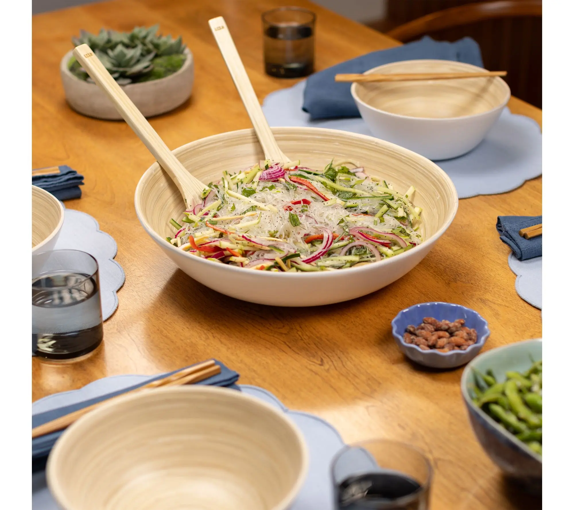 From backyard gatherings to weeknight dinners, the Lexa Bamboo 5 Piece Bowl and Utensil Set makes sharing salads, snacks, or sides effortless and inviting. Crafted for both beauty and function, this serveware is ready to elevate any meal -- whether you're hosting friends or simply adding a natural accent to your table. From Lexa.