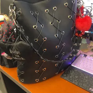 This bag is mad cute with little heart grommets all over. It’s a very deep bag can probably fit a 13 or 14 inch laptop if you want to stuff it in there. But I have my genesis for that 😍 This is just perfect for all my extras. And the Mother Fox handmade keychain! Perfection! 🖤