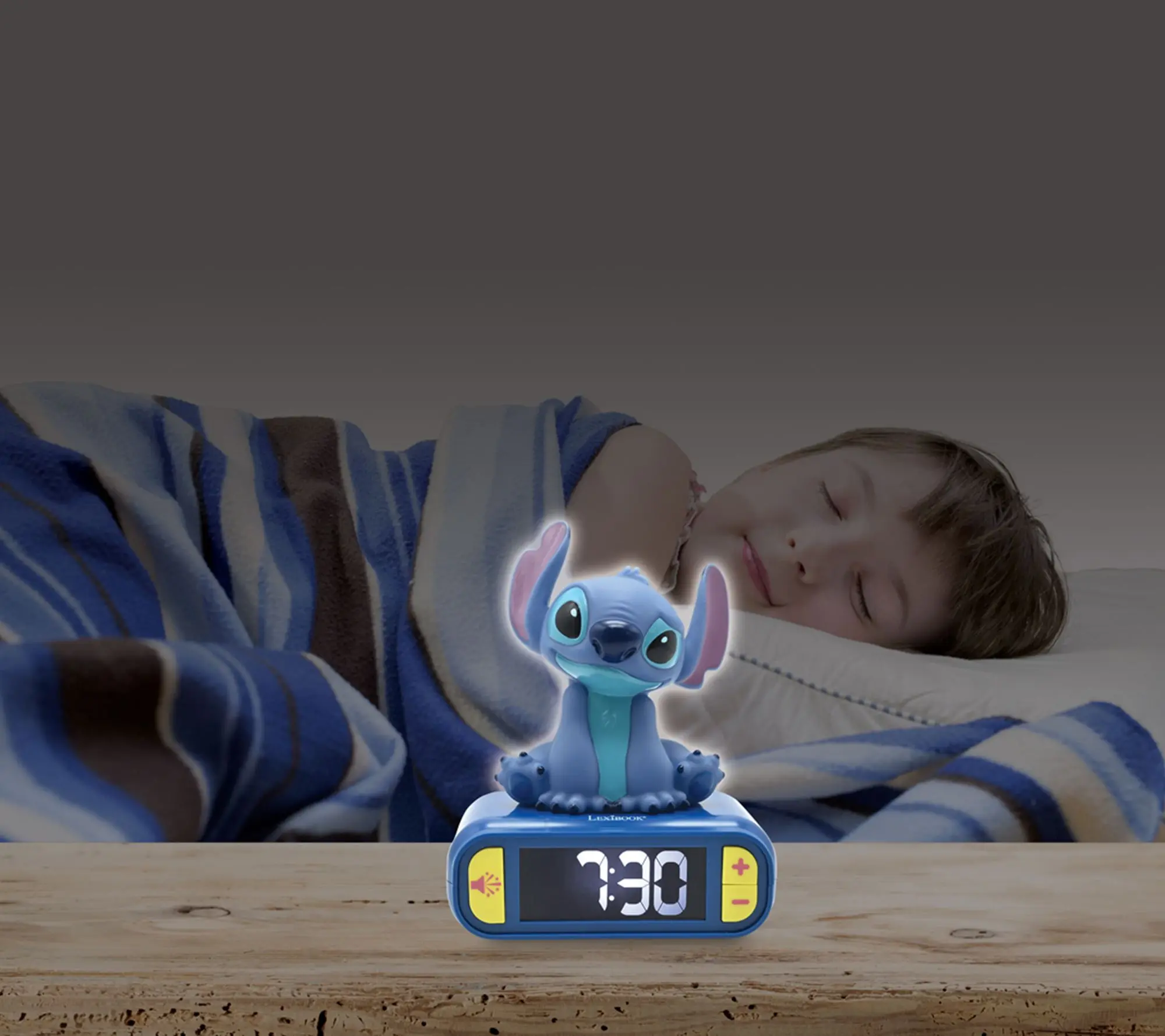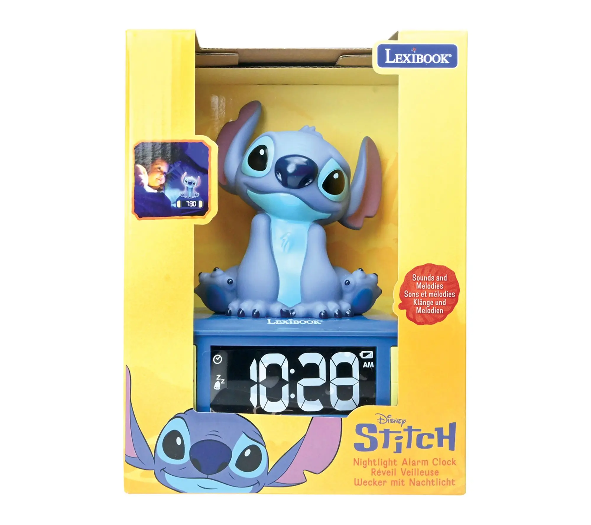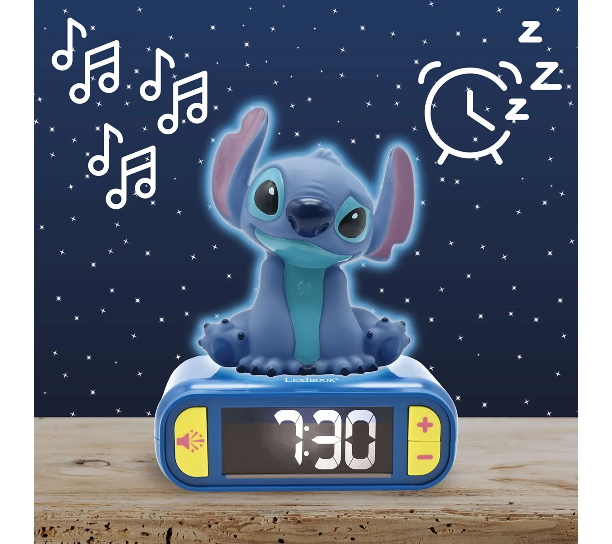 Brighten up mornings with this 3D Stitch digital alarm clock, featuring fun light and sound effects that bring a playful touch to any bedside. With an LCD backlit screen, customizable alarm ringtones, and easy snooze function, it's designed to make waking up more enjoyable for kids and fans alike. From Lexibook.