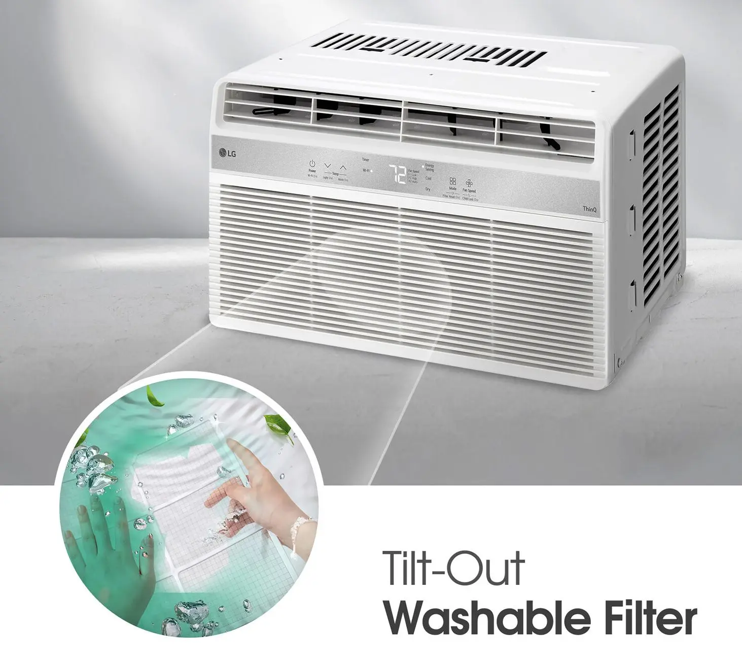 Help keep your space cool and comfortable all summer long with this 10,000 BTU window air conditioner, designed to let you easily adjust settings using your smartphone or voice commands. Three cooling speeds, a 24-hour timer, and four-way air deflection help you customize comfort exactly how you like it, while the quiet operation keeps things peaceful. From LG.