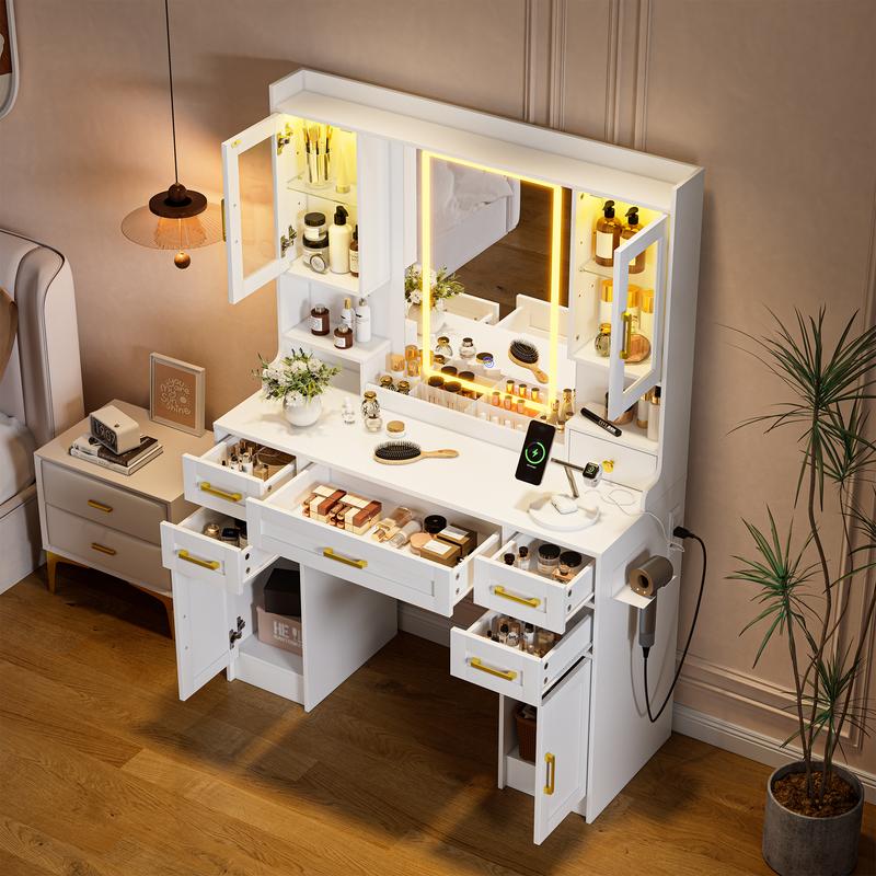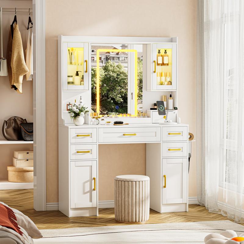 ·Ample Storage Space Measuring 41.34" x 15.75" x 57.72", this large vanity offers unmatched storage options: 5 spacious drawers, 4 open shelves, 2 RGB-lit glass cabinets, and 4 additional cabinets. Perfect for organizing jewelry, makeup, and hair accessories, it ensures a clutter-free bedroom or dressing room while keeping everything at your fingertips.