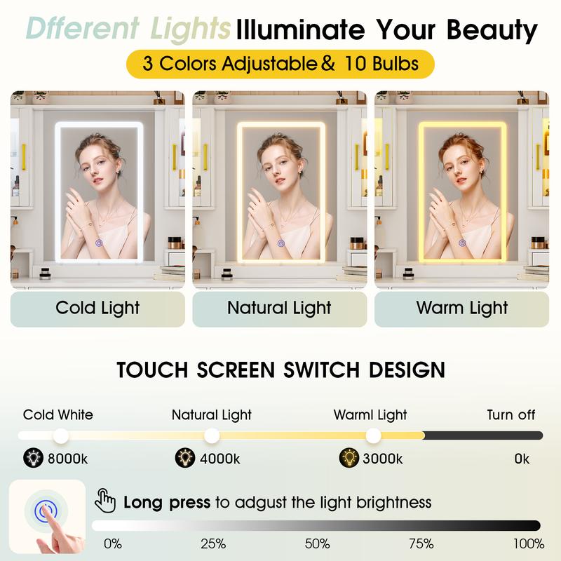 ·HD Mirror with Adjustable LED Lighting: The integrated LED strip offers 3 lighting modes (Cool, Warm, and Natural) with a touch-sensitive interface for effortless switching. Plus, you can adjust the brightness to match your needs, ensuring optimal lighting for your makeup application.
