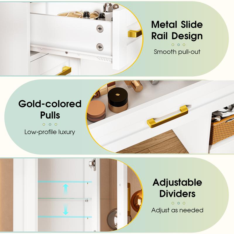 ·Convenient Power Strip & Hair Dryer Holder Stay connected with 2 power outlets and 2 USB ports, ideal for charging your devices or powering your hair tools. The included hairdryer stand adds convenience, making this dresser perfect for bedrooms, dressing rooms, salons, or live-stream setups.