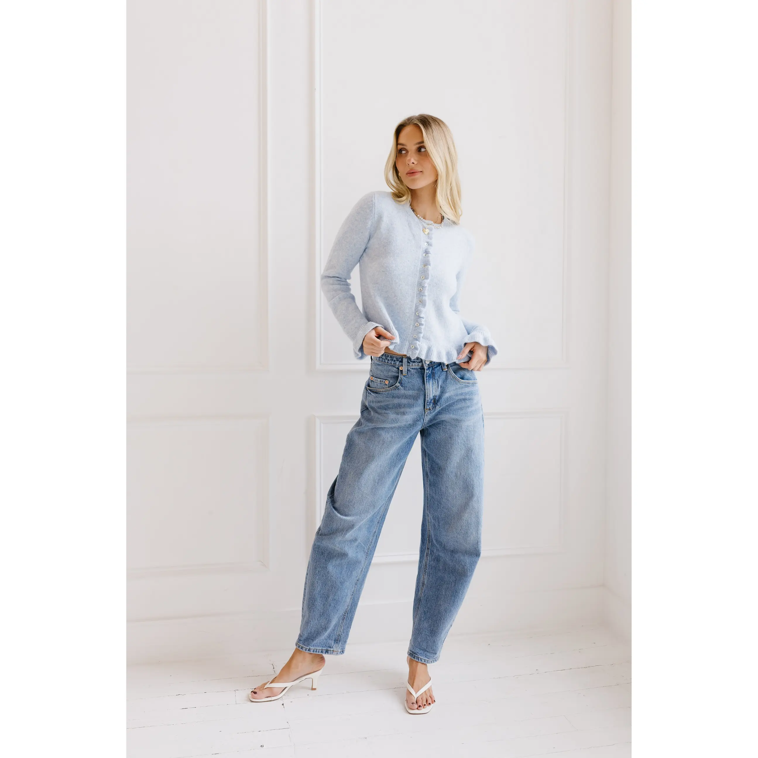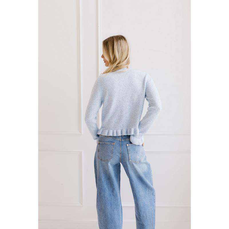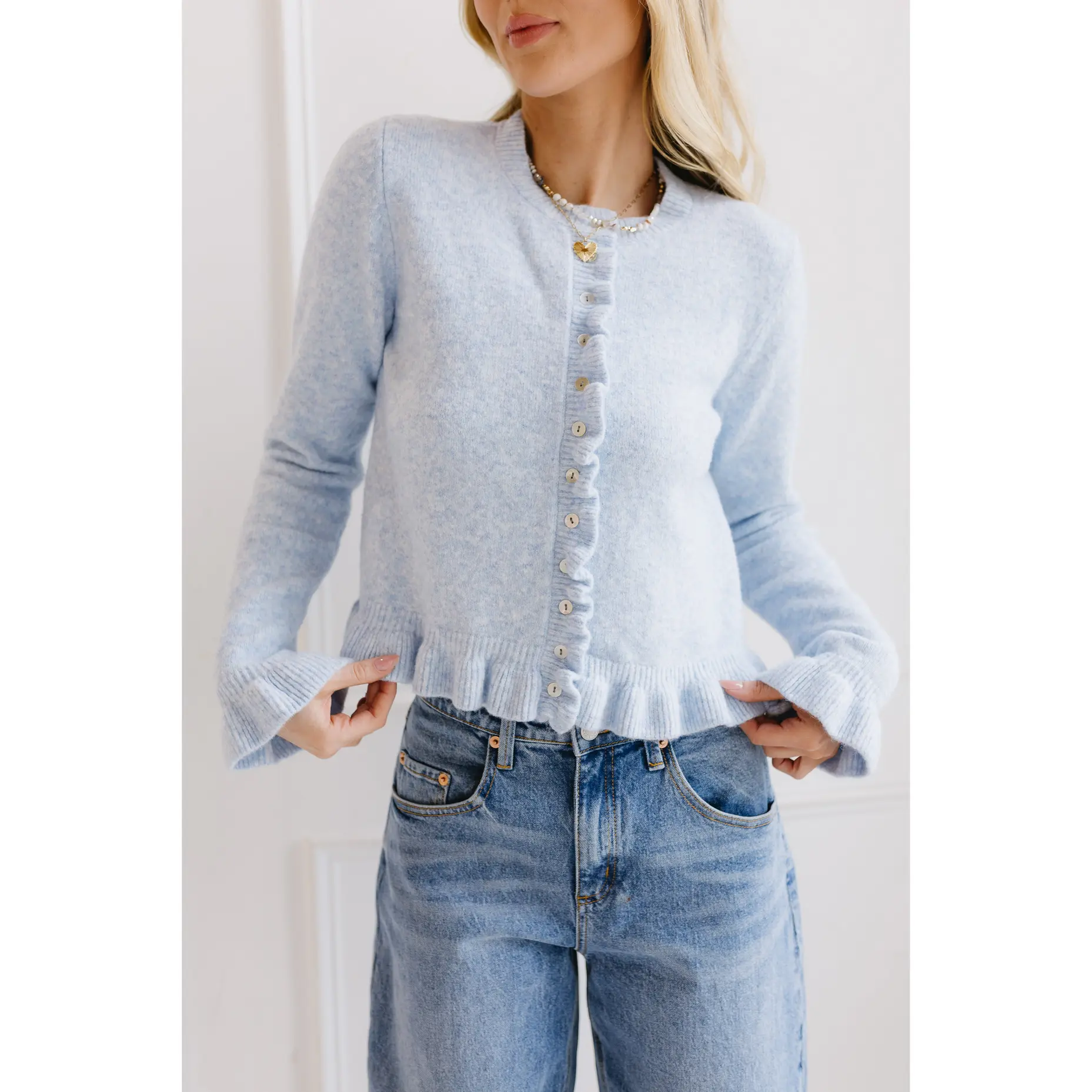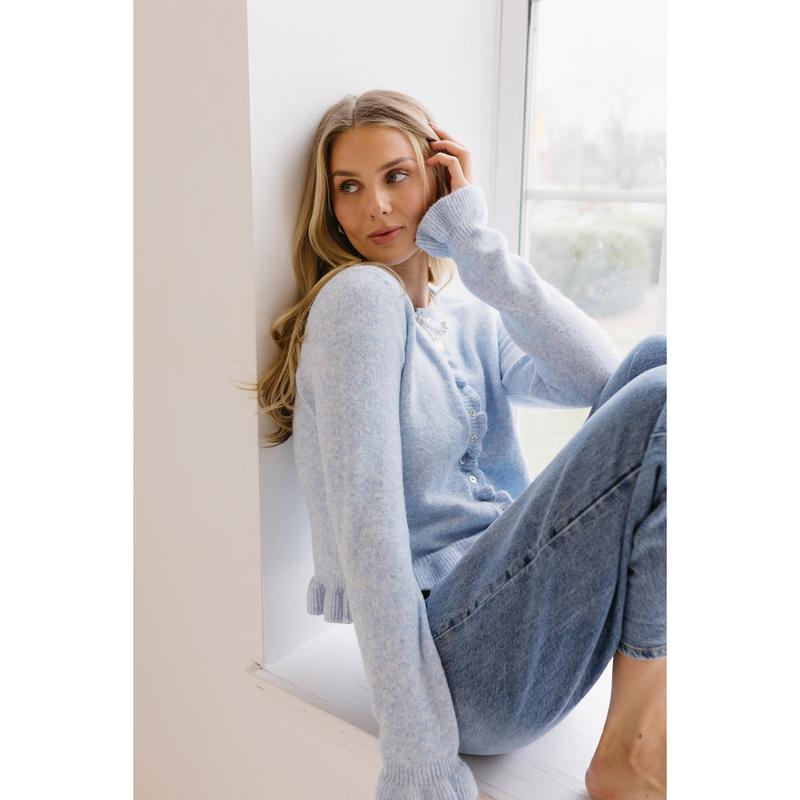 the ruffle trim details on the sleeve but also at the button is so cute and makes a button cardigan sweater a whole lot more fun 😌 size XS I’m 5’4 and the baby blue is perfect  #caridganstyle #cardigansweater #rufflecardigan #tiktokshopcreatorpicks #bluesweater @vestique